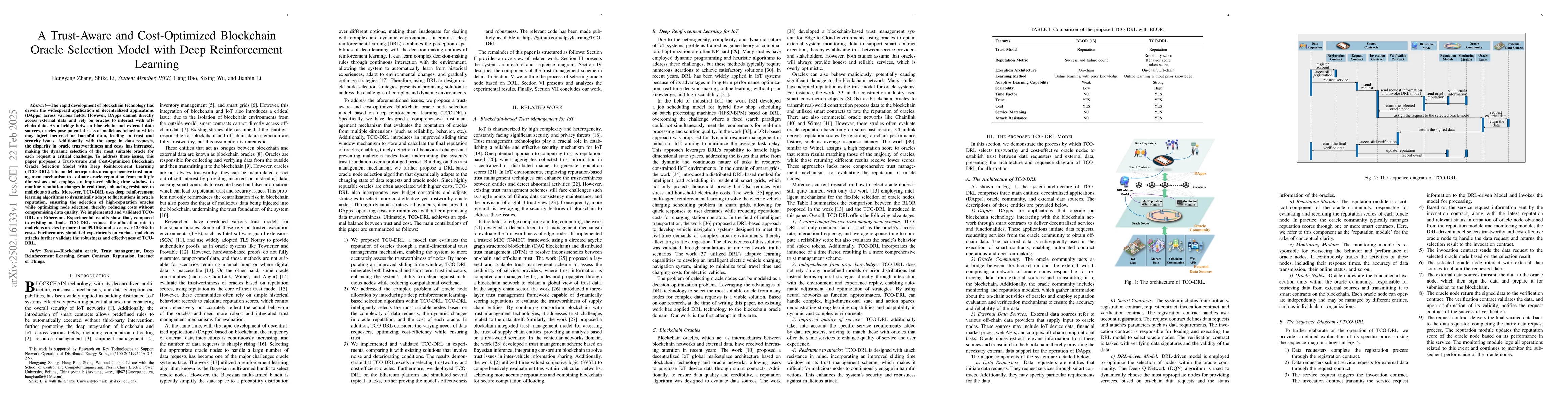 TCO-DRL differentiates itself by employing a comprehensive trust management mechanism, an improved sliding time window, and Deep Reinforcement Learning, addressing both trust and cost optimization challenges in blockchain oracle selection.