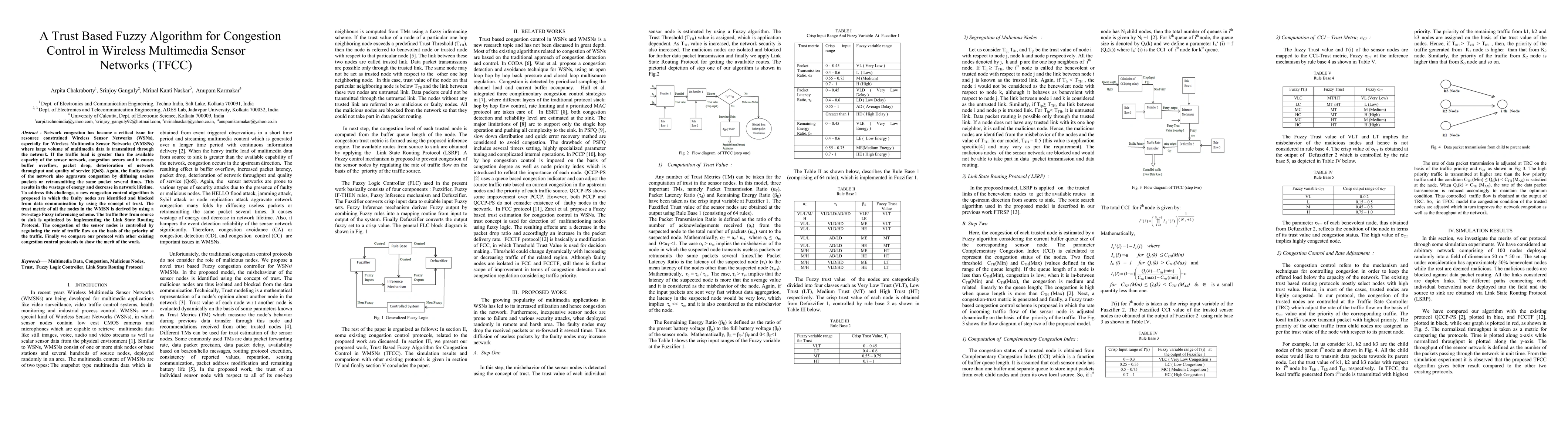 The paper proposes a Trust Based Fuzzy Algorithm for Congestion Control (TFCC) in Wireless Multimedia Sensor Networks to manage congestion by identifying and blocking faulty nodes using trust metrics derived via a two-stage Fuzzy inferencing scheme, optimizing traffic flow with Link State Routing Protocol, and regulating traffic rate based on priority to improve network throughput and QoS. Comparative analysis demonstrates the effectiveness of the proposed method over existing protocols.