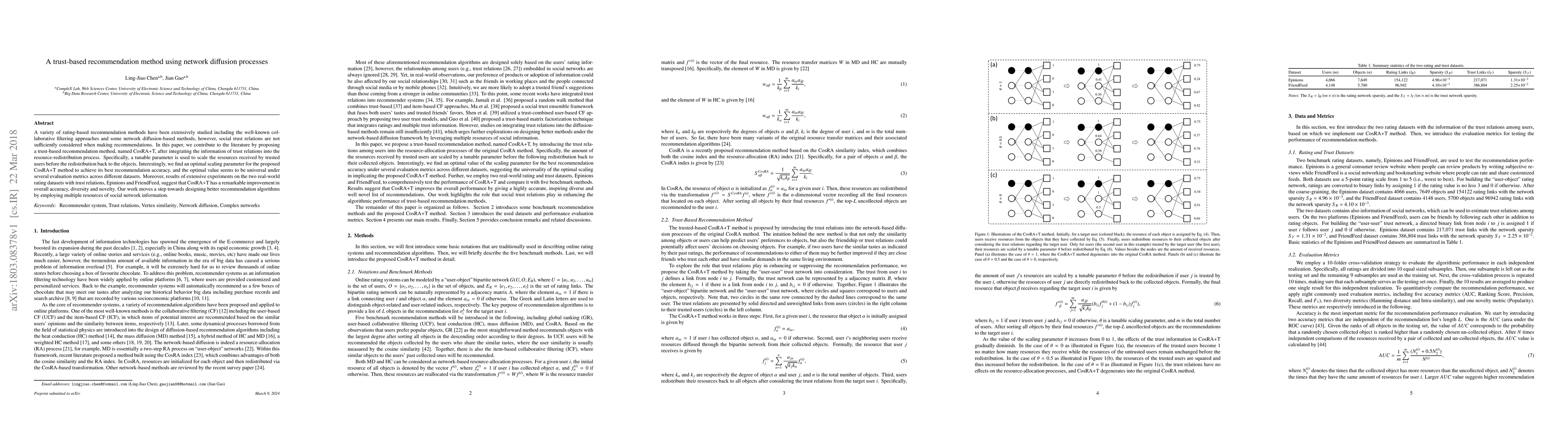 This paper proposes CosRA+T, a trust-based recommendation method that integrates trust relations into network diffusion processes, achieving improved recommendation accuracy, diversity, and novelty. An optimal scaling parameter is identified to enhance performance across various datasets.