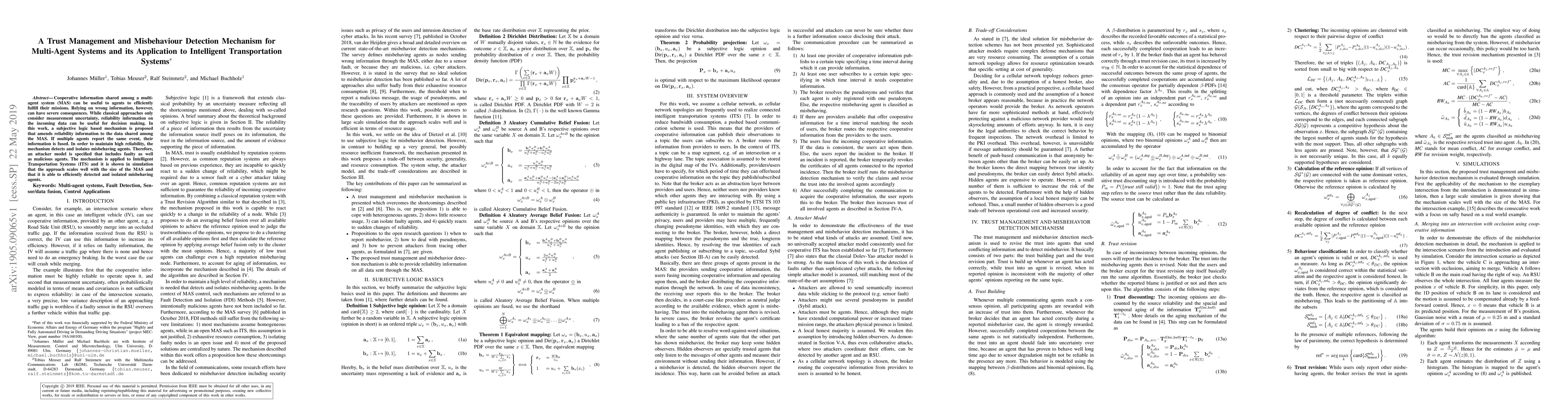 Cooperative information shared among a multi-agent system (MAS) can be useful to agents to efficiently fulfill their missions. Relying on wrong information, however, can have severe consequences. While classical approaches only consider measurement uncertainty, reliability information on the incoming data can be useful for decision making. In this work, a subjective logic based mechanism is proposed that amends reliability information to the data shared among the MAS. If multiple agents report the same event, their information is fused. In order to maintain high reliability, the mechanism detects and isolates misbehaving agents. Therefore, an attacker model is specified that includes faulty as well as malicious agents. The mechanism is applied to Intelligent Transportation Systems (ITS) and it is shown in simulation that the approach scales well with the size of the MAS and that it is able to efficiently detected and isolated misbehaving agents. Keywords: Multi-agent systems, Fault Detection, Sensor/data fusion, Control Applications