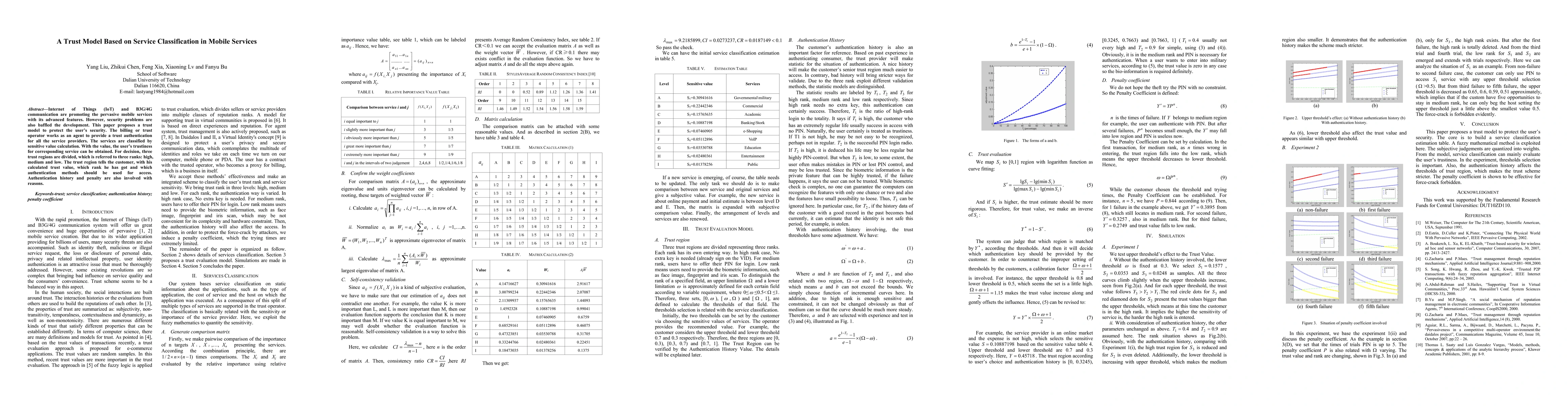 Internet of Things (IoT) and B3G/4G communication are promoting the pervasive mobile services with its advanced features. However, security problems are also baffled the development. This paper proposes a trust model to protect the user's security. The billing or trust operator works as an agent to provide a trust authentication for all the service providers. The services are classified by sensitive value calculation. With the value, the user's trustiness for corresponding service can be obtained. For decision, three trust regions are divided, which is referred to three ranks: high, medium and low. The trust region tells the customer, with his calculated trust value, which rank he has got and which authentication methods should be used for access. Authentication history and penalty are also involved with reasons.