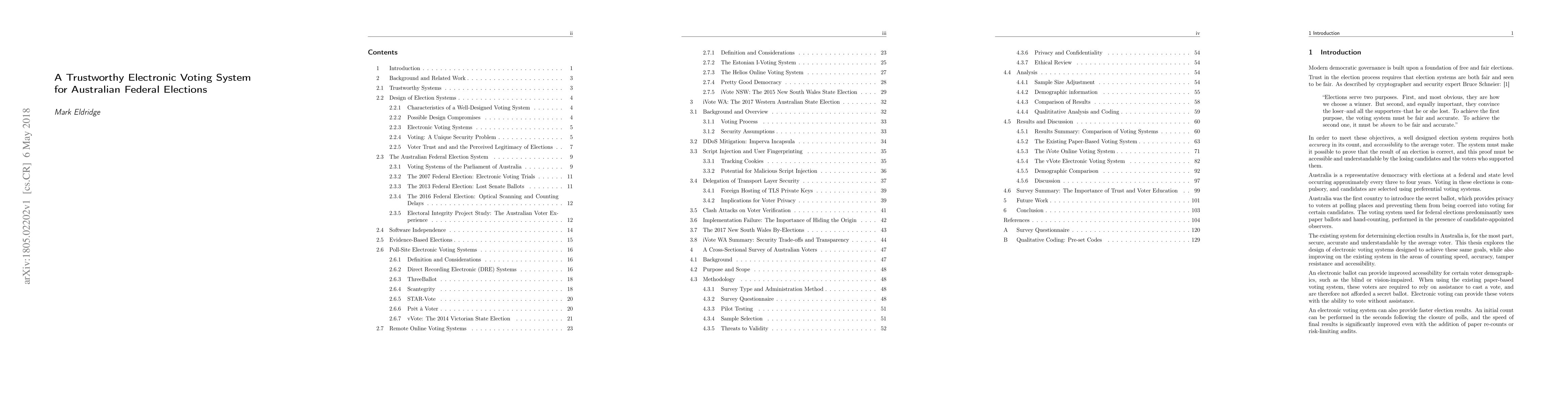 This thesis explores the design of electronic voting systems for Australian federal elections to improve security, accuracy, and accessibility while maintaining trust among voters. It presents key findings on the security risks of existing systems and informs recommendations for future research and public policy regarding electronic voting systems.