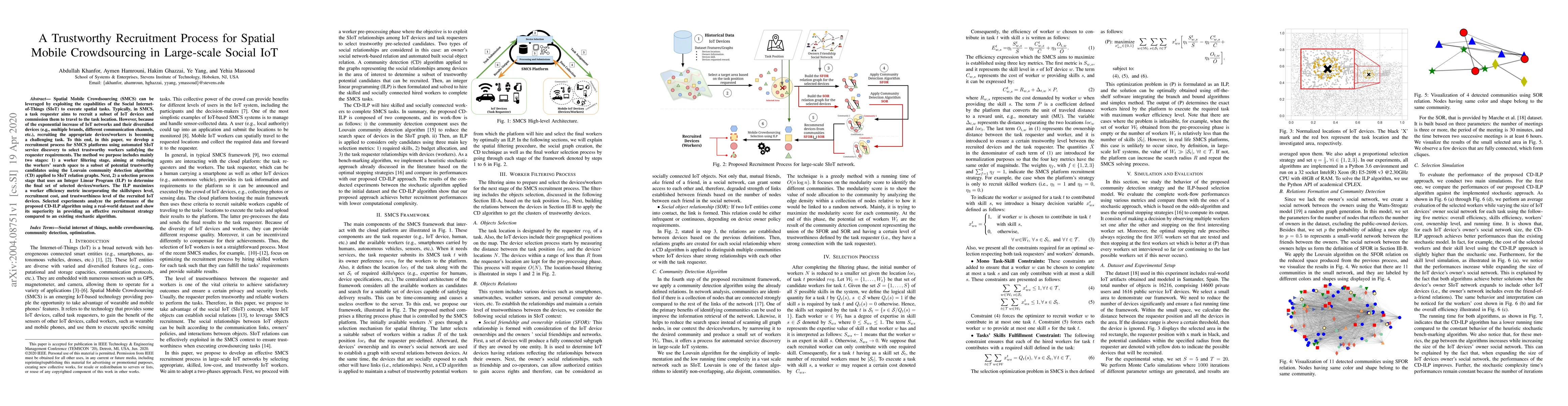 This paper proposes a recruitment process for Spatial Mobile Crowdsourcing in large-scale Social Internet-of-Things (SIoT) environments, utilizing automated service discovery. It employs Louvain community detection to filter potential trustworthy workers and an Integer Linear Program to select the optimal set based on efficiency, cost, and trustworthiness.