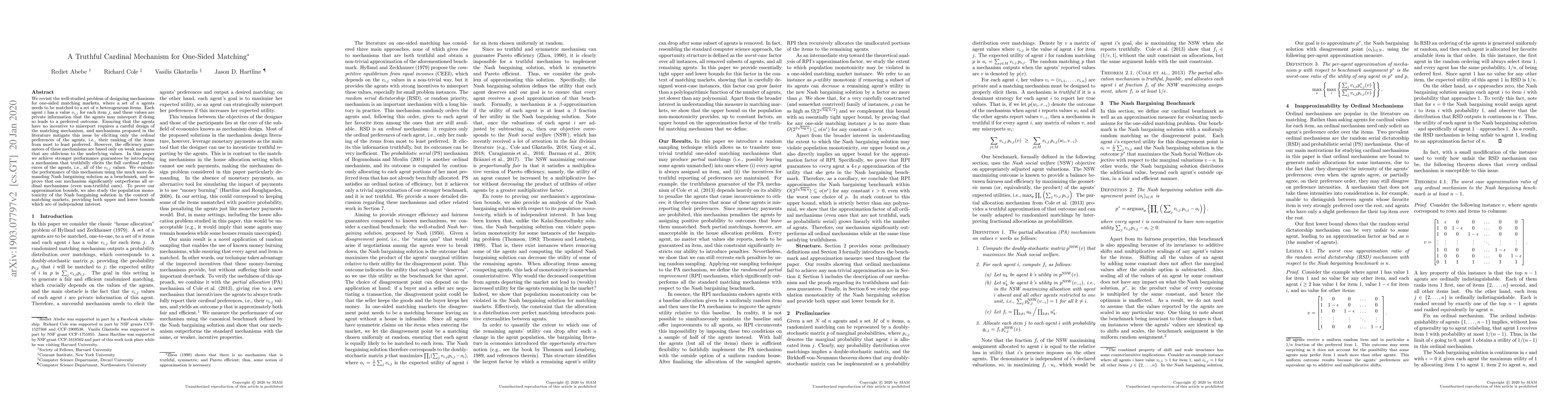 We revisit the well-studied problem of designing mechanisms for one-sided matching markets, where a set of $n$ agents needs to be matched to a set of $n$ heterogeneous items. Each agent $i$ has a value $v_{i,j}$ for each item $j$, and these values are private information that the agents may misreport if doing so leads to a preferred outcome. Ensuring that the agents have no incentive to misreport requires a careful design of the matching mechanism, and mechanisms proposed in the literature mitigate this issue by eliciting only the \emph{ordinal} preferences of the agents, i.e., their ranking of the items from most to least preferred. However, the efficiency guarantees of these mechanisms are based only on weak measures that are oblivious to the underlying values. In this paper we achieve stronger performance guarantees by introducing a mechanism that truthfully elicits the full \emph{cardinal} preferences of the agents, i.e., all of the $v_{i,j}$ values. We evaluate the performance of this mechanism using the much more demanding Nash bargaining solution as a benchmark, and we prove that our mechanism significantly outperforms all ordinal mechanisms (even non-truthful ones). To prove our approximation bounds, we also study the population monotonicity of the Nash bargaining solution in the context of matching markets, providing both upper and lower bounds which are of independent interest.