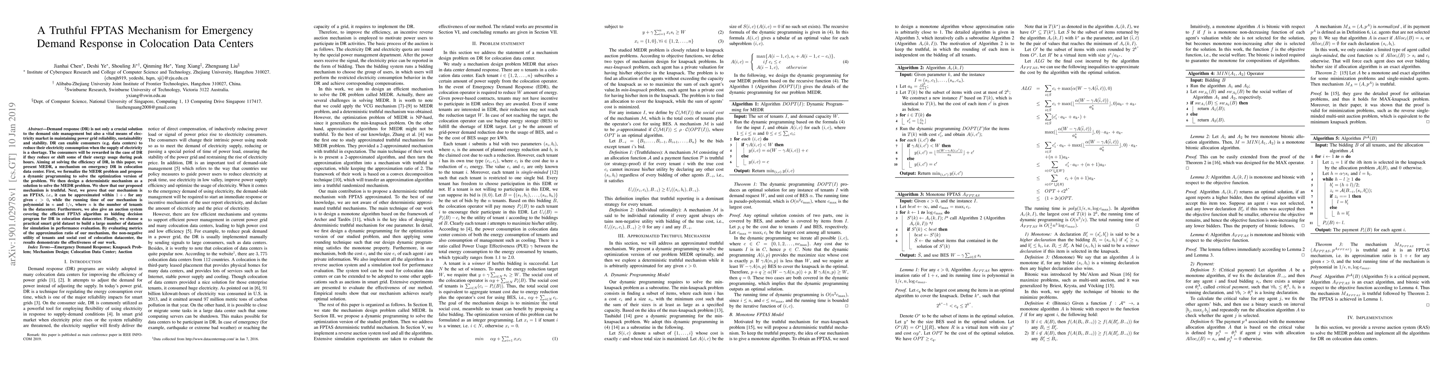 Demand response (DR) is not only a crucial solution to the demand side management but also a vital means of electricity market in maintaining power grid reliability, sustainability and stability. DR can enable consumers (e.g. data centers) to reduce their electricity consumption when the supply of electricity is a shortage. The consumers will be rewarded in the case of DR if they reduce or shift some of their energy usage during peak hours. Aiming at solving the efficiency of DR, in this paper, we present MEDR, a mechanism on emergency DR in colocation data center. First, we formalize the MEDR problem and propose a dynamic programming to solve the optimization version of the problem. We then design a deterministic mechanism as a solution to solve the MEDR problem. We show that our proposed mechanism is truthful. Next, we prove that our mechanism is an FPTAS, i.e., it can be approximated within $1 + \epsilon$ for any given $\epsilon > 0$, while the running time of our mechanism is polynomial in $n$ and $1/\epsilon$, where $n$ is the number of tenants in the datacenter. Furthermore, we also give an auction system covering the efficient FPTAS algorithm as bidding decision program for DR in colocation datacenter. Finally, we choose a practical smart grid dataset to build a large number of datasets for simulation in performance evaluation. By evaluating metrics of the approximation ratio of our mechanism, the non-negative utility of tenants and social cost of colocation datacenter, the results demonstrate the effectiveness of our work.