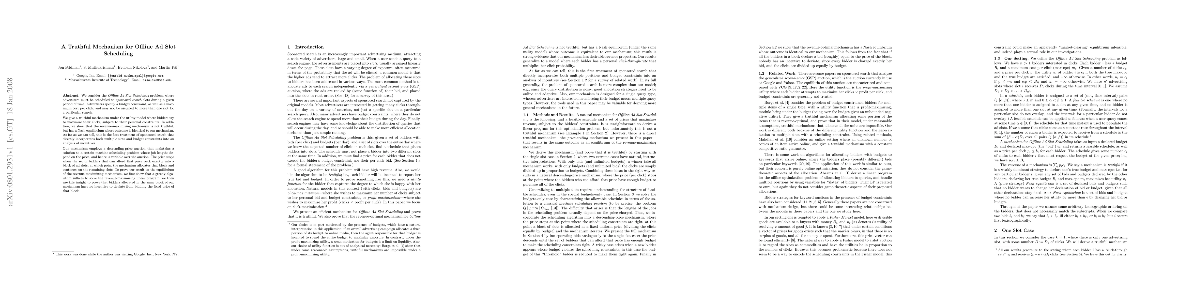 We consider the "Offline Ad Slot Scheduling" problem, where advertisers must be scheduled to "sponsored search" slots during a given period of time. Advertisers specify a budget constraint, as well as a maximum cost per click, and may not be assigned to more than one slot for a particular search. We give a truthful mechanism under the utility model where bidders try to maximize their clicks, subject to their personal constraints. In addition, we show that the revenue-maximizing mechanism is not truthful, but has a Nash equilibrium whose outcome is identical to our mechanism. As far as we can tell, this is the first treatment of sponsored search that directly incorporates both multiple slots and budget constraints into an analysis of incentives. Our mechanism employs a descending-price auction that maintains a solution to a certain machine scheduling problem whose job lengths depend on the price, and hence is variable over the auction. The price stops when the set of bidders that can afford that price pack exactly into a block of ad slots, at which point the mechanism allocates that block and continues on the remaining slots. To prove our result on the equilibrium of the revenue-maximizing mechanism, we first show that a greedy algorithm suffices to solve the revenue-maximizing linear program; we then use this insight to prove that bidders allocated in the same block of our mechanism have no incentive to deviate from bidding the fixed price of that block.