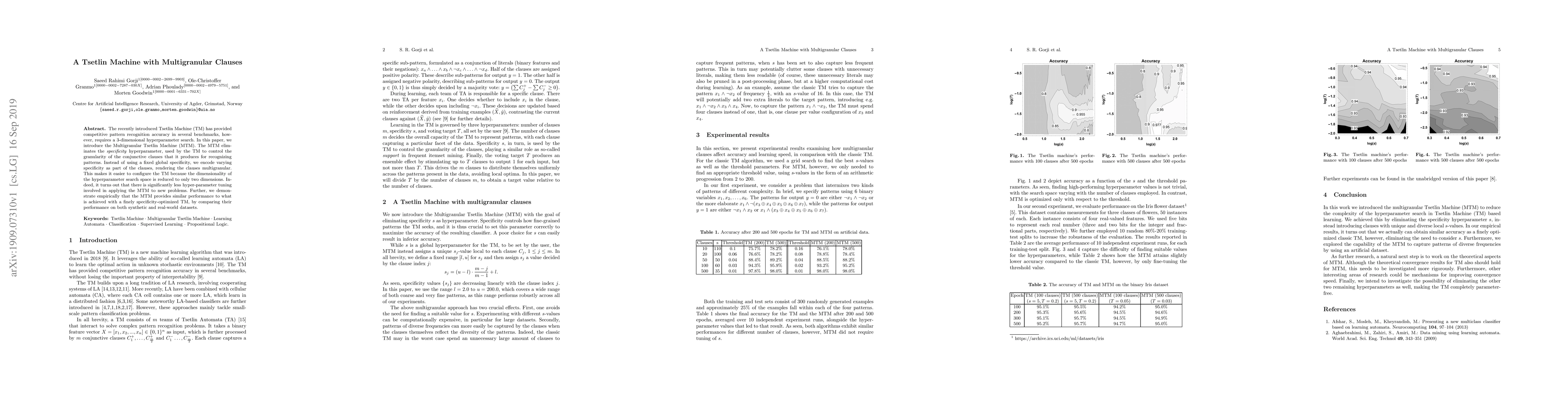 The Multigranular Tsetlin Machine (MTM) simplifies the Tsetlin Machine's hyperparameter tuning by encoding varying specificity within the clauses, reducing the search space to two dimensions and maintaining comparable performance to the original TM. This innovation eases configuration and reduces the need for extensive hyperparameter optimization.
