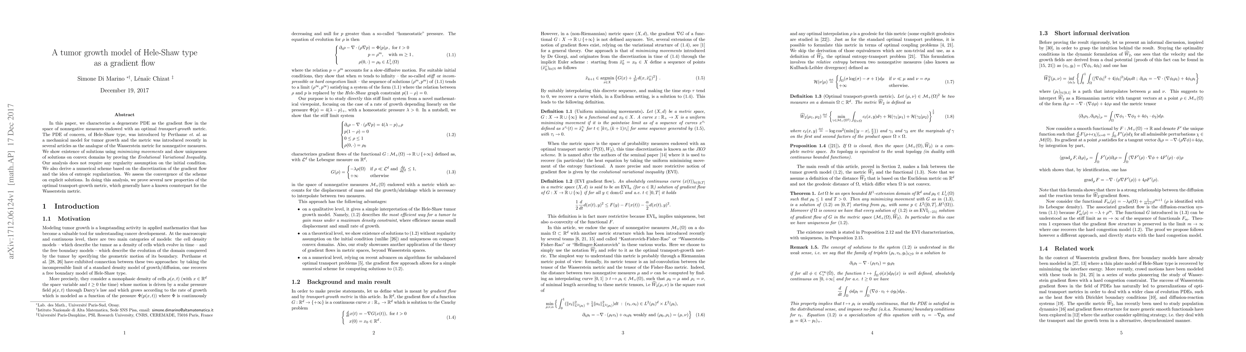 In this paper, we characterize a degenerate PDE as the gradient flow in the space of nonnegative measures endowed with an optimal transport-growth metric. The PDE of concern, of Hele-Shaw type, was introduced by Perthame et. al. as a mechanical model for tumor growth and the metric was introduced recently in several articles as the analogue of the Wasserstein metric for nonnegative measures. We show existence of solutions using minimizing movements and show uniqueness of solutions on convex domains by proving the Evolutional Variational Inequality. Our analysis does not require any regularity assumption on the initial condition. We also derive a numerical scheme based on the discretization of the gradient flow and the idea of entropic regularization. We assess the convergence of the scheme on explicit solutions. In doing this analysis, we prove several new properties of the optimal transport-growth metric, which generally have a known counterpart for the Wasserstein metric.