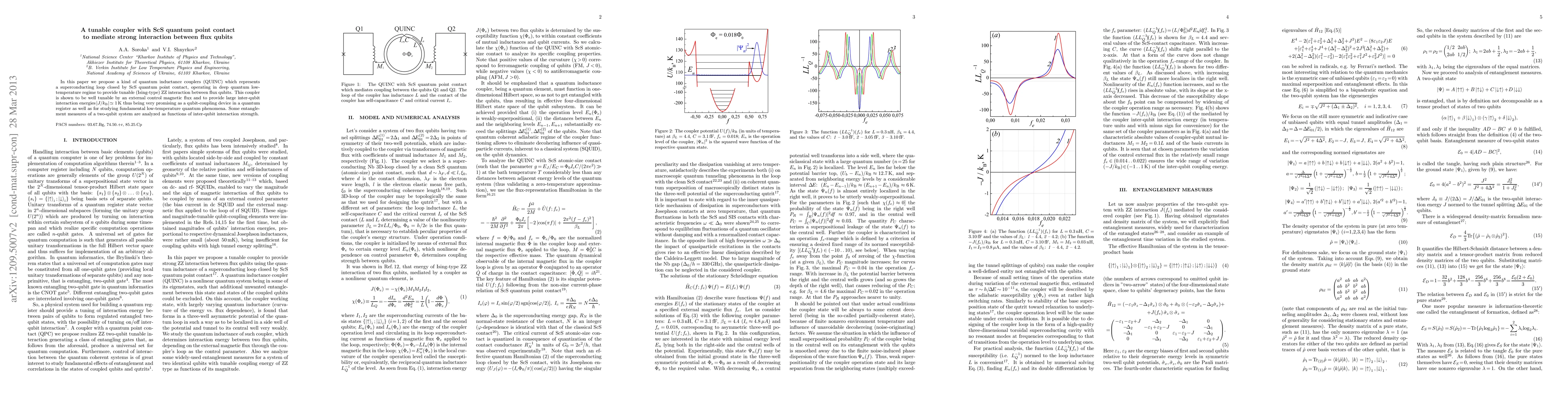 In this paper we propose a kind of quantum inductance couplers (QUINC) which represents a superconducting loop closed by ScS quantum point contact, operating in deep quantum low-temperature regime to provide tunable (Ising-type) ZZ interaction between flux qubits. This coupler is shown to be well tunable by an external control magnetic flux and to provide large inter-qubit interaction energies $|J/k_{\rm B}|\simeq1$ K thus being very promising as a qubit-coupling device in a quantum register as well as for studying fundamental low-temperature quantum phenomena. Some entanglement measures of a two-qubit system are analyzed as functions of inter-qubit interaction strength.