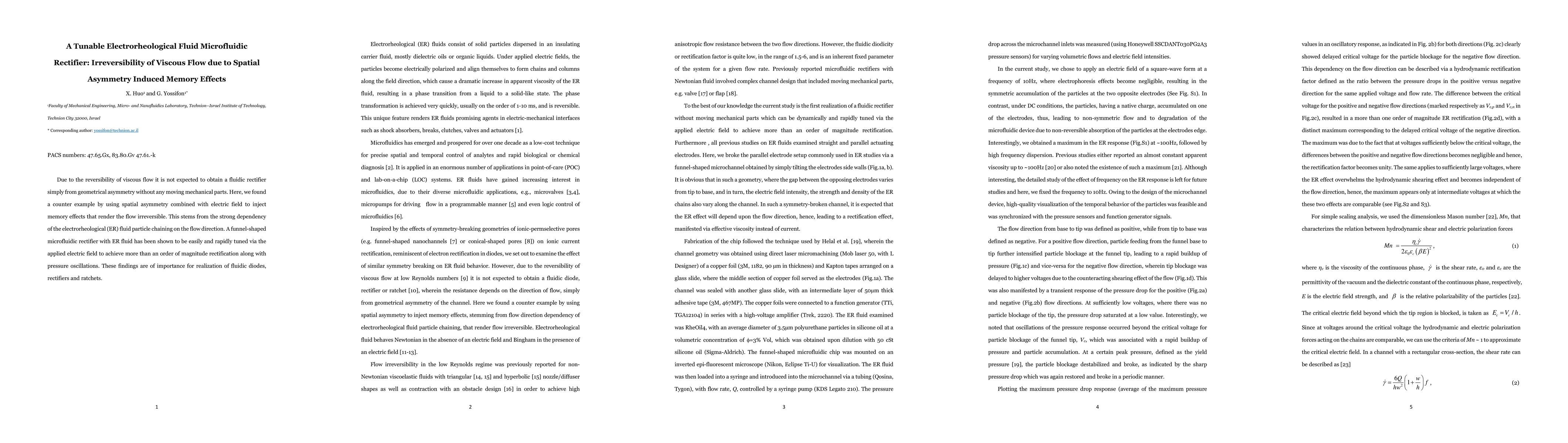 Due to the reversibility of viscous flow it is not expected to obtain a fluidic rectifier simply from geometrical asymmetry without any moving mechanical parts. Here, we found a counter example by using spatial asymmetry combined with electric field to inject memory effects that render the flow irreversible. This stems from the strong dependency of the electrorheological (ER) fluid particle chaining on the flow direction. A funnel-shaped microfluidic rectifier with ER fluid has been shown to be easily and rapidly tuned via the applied electric field to achieve more than an order of magnitude rectification along with pressure oscillations. These findings are of importance for realization of fluidic diodes, rectifiers and ratchets.