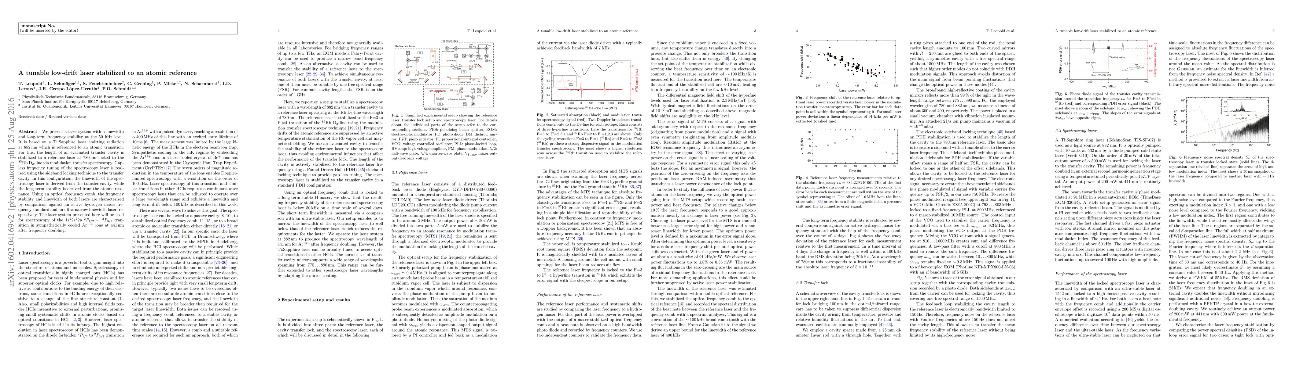 We present a laser system with a linewidth and long-term frequency stability at the 50 kHz level. It is based on a Ti:Sapphire laser emitting radiation at 882 nm which is referenced to an atomic transition. For this, the length of an evacuated transfer cavity is stabilized to a reference laser at 780 nm locked to the $^{85}$Rb D$_2$-line via modulation transfer spectroscopy. Gapless frequency tuning of the spectroscopy laser is realized using the sideband locking technique to the transfer cavity. In this configuration, the linewidth of the spectroscopy laser is derived from the transfer cavity, while the long-term stability is derived from the atomic resonance. Using an optical frequency comb, the frequency stability and linewidth of both lasers are characterized by comparison against an active hydrogen maser frequency standard and an ultra-narrow linewidth laser, respectively. The laser system presented here will be used for spectroscopy of the $1s^{2}2s^{2}2p\ ^{2}P_{1/2} -\ ^{2}P_{3/2}$ transition in sympathetically cooled Ar$^{13+}$ ions at 441nm after frequency doubling.
