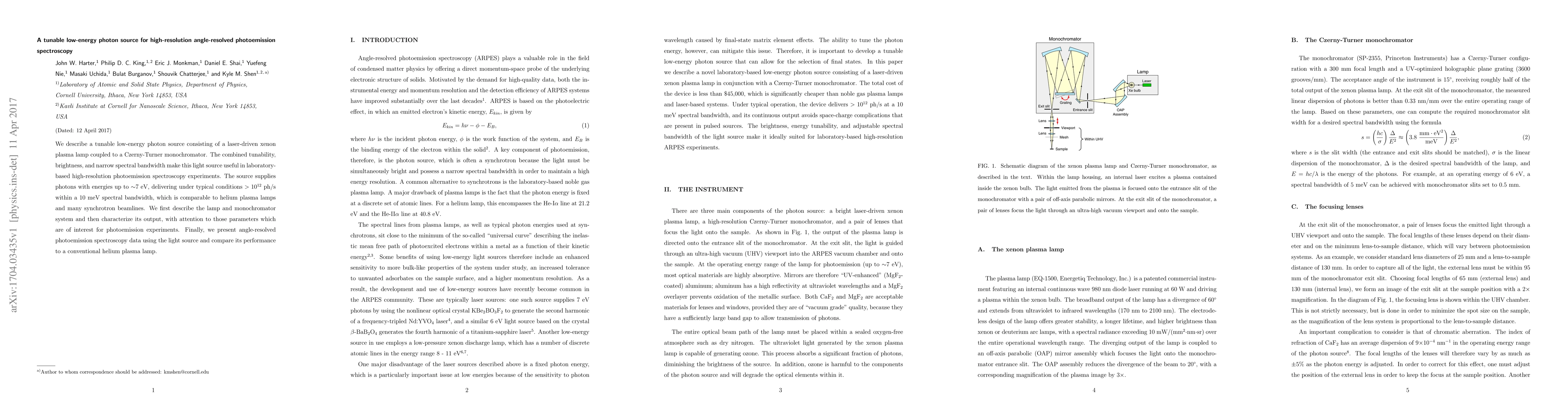 This paper introduces a tunable low-energy photon source for high-resolution angle-resolved photoemission spectroscopy, utilizing a laser-driven xenon plasma lamp and a Czerny-Turner monochromator. The source provides photons up to 7 eV with high brightness and narrow bandwidth, comparable to helium plasma lamps and synchrotron beamlines.