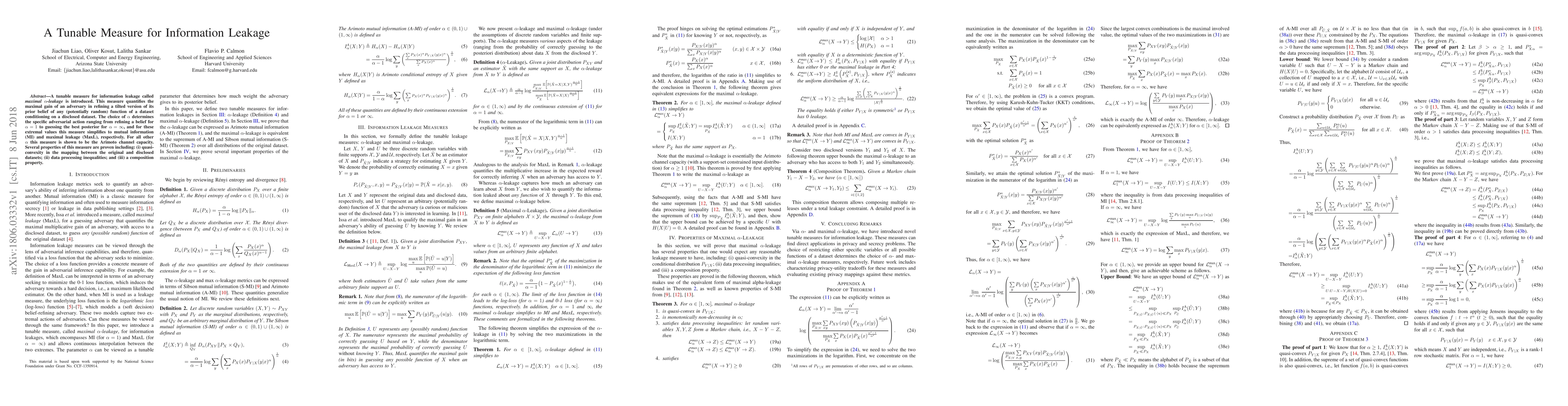 A new measure called maximal alpha-leakage is introduced to quantify information leakage from a dataset, with adjustable sensitivity parameter α. This measure relates to mutual information and Arimoto channel capacity under different values of α.