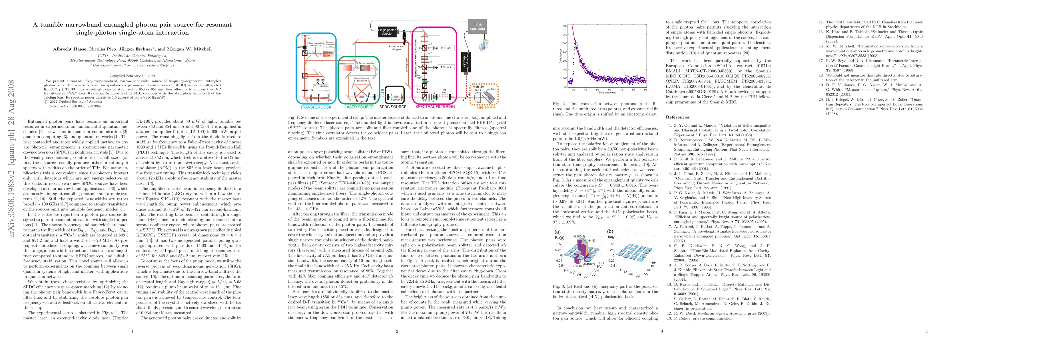 This research introduces a tunable entangled photon pair source based on SPDC in PPKTP, designed for resonant interaction with 40Ca+ ions by stabilizing the wavelength at 850 or 854 nm, with a narrow bandwidth of 22 MHz matching the ions' absorption bandwidth. The source generates entangled pairs at a spectral power density of 1.0 pair/(s MHz mW).