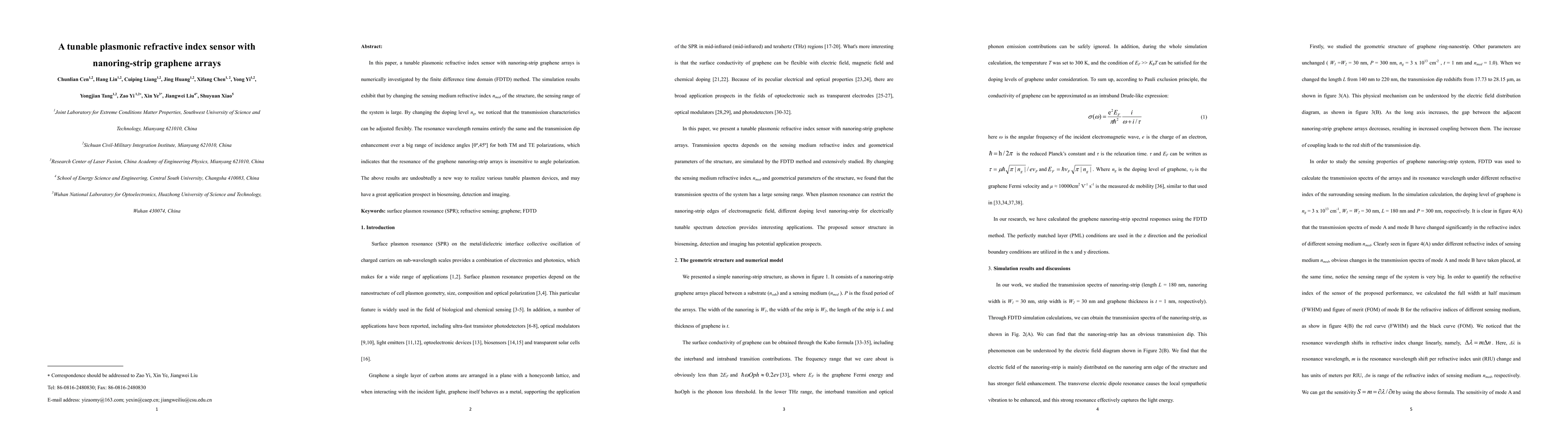 In this paper, a tunable plasmonic refractive index sensor with nanoring-strip graphene arrays is numerically investigated by the finite difference time domain (FDTD) method. The simulation results exhibit that by changing the sensing medium refractive index nmed of the structure, the sensing range of the system is large. By changing the doping level ng, we noticed that the transmission characteristics can be adjusted flexibly. The resonance wavelength remains entirely the same and the transmission dip enhancement over a big range of incidence angles [0,45] for both TM and TE polarizations, which indicates that the resonance of the graphene nanoring-strip arrays is insensitive to angle polarization. The above results are undoubtedly a new way to realize various tunable plasmon devices, and may have a great application prospect in biosensing, detection and imaging.