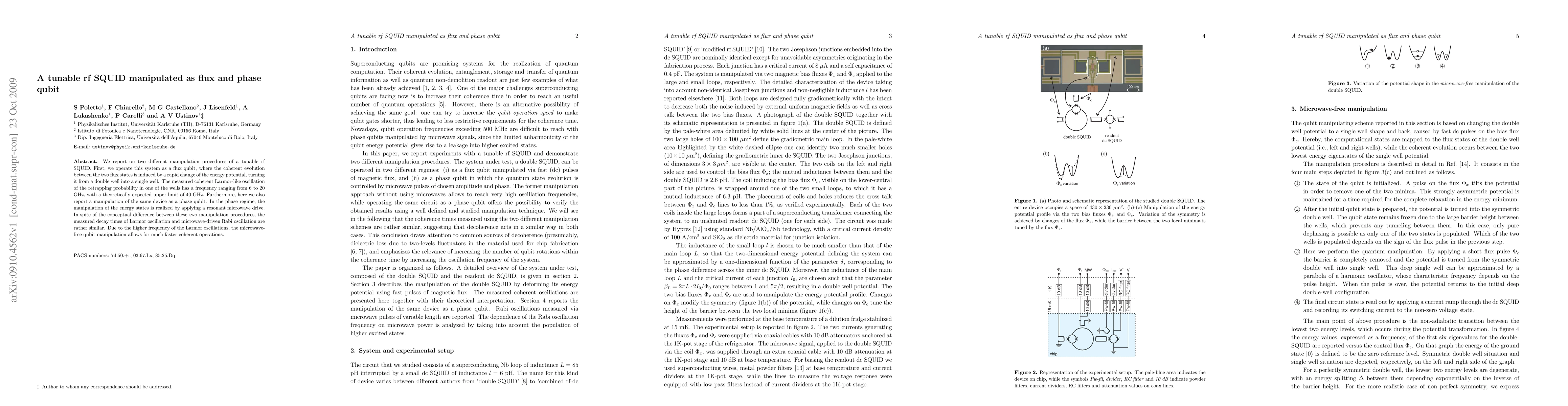 This paper explores the manipulation of a tunable rf SQUID as both a flux and phase qubit, demonstrating coherent oscillations in both regimes with frequencies up to 20 GHz, and highlighting the potential for faster operations via microwave-free manipulation.