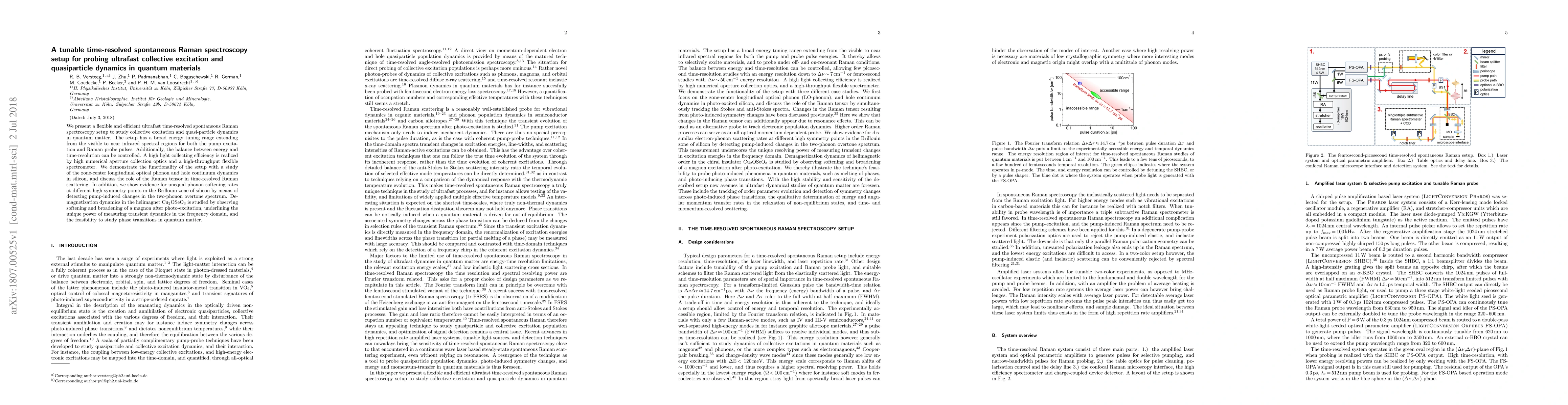 We present a flexible and efficient ultrafast time-resolved spontaneous Raman spectroscopy setup to study collective excitation and quasi-particle dynamics in quantum matter. The setup has a broad energy tuning range extending from the visible to near infrared spectral regions for both the pump excitation and Raman probe pulses. Additionally, the balance between energy and time-resolution can be controlled. A high light collecting efficiency is realized by high numerical aperture collection optics and a high-throughput flexible spectrometer. We demonstrate the functionality of the setup with a study of the zone-center longitudinal optical phonon and hole continuum dynamics in silicon, and discuss the role of the Raman tensor in time-resolved Raman scattering. In addition, we show evidence for unequal phonon softening rates at different high symmetry points in the Brillouin zone of silicon by means of detecting pump-induced changes in the two-phonon overtone spectrum. Demagnetization dynamics in the helimagnet Cu2OSeO3 is studied by observing softening and broadening of a magnon after photo-excitation, underlining the unique power of measuring transient dynamics in the frequency domain, and the feasibility to study phase transitions in quantum matter.