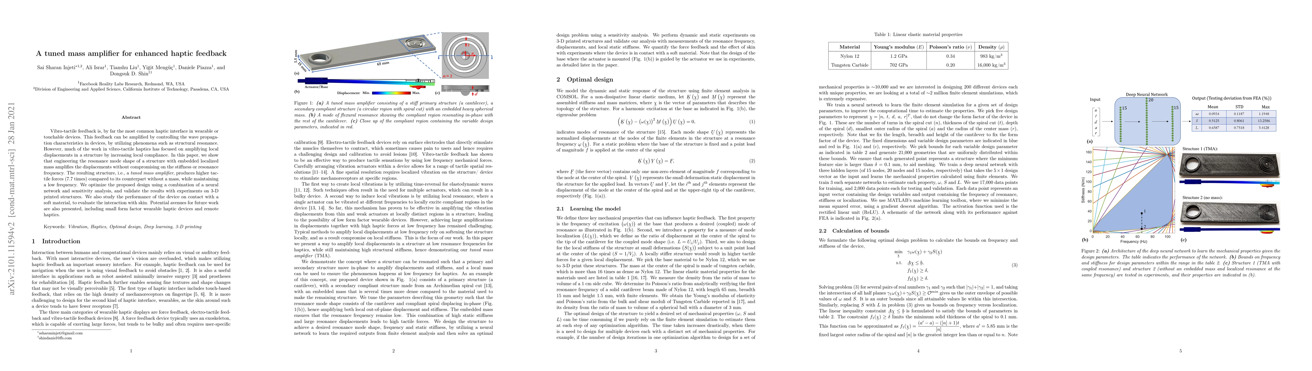 Vibro-tactile feedback is, by far the most common haptic interface in wearable or touchable devices. This feedback can be amplified by controlling the wave propagation characteristics in devices, by utilizing phenomena such as structural resonance. However, much of the work in vibro-tactile haptics has focused on amplifying local displacements in a structure by increasing local compliance. In this paper, we show that engineering the resonance mode shape of a structure with embedded localized mass amplifies the displacements without compromising on the stiffness or resonance frequency. The resulting structure, i.e., a tuned mass amplifier, produces higher tactile forces (7.7 times) compared to its counterpart without a mass, while maintaining a low frequency. We optimize the proposed design using a combination of a neural network and sensitivity analysis, and validate the results with experiments on 3-D printed structures. We also study the performance of the device on contact with a soft material, to evaluate the interaction with skin. Potential avenues for future work are also presented, including small form factor wearable haptic devices and remote haptics.