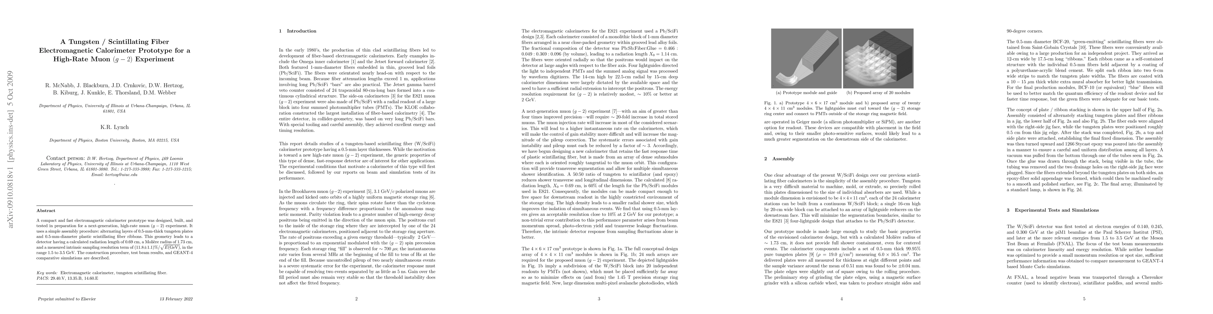 A compact and fast electromagnetic calorimeter prototype was designed, built, and tested in preparation for a next-generation, high-rate muon g-2 experiment. It uses a simple assembly procedure: alternating layers of 0.5-mm-thick tungsten plates and 0.5-mm-diameter plastic scintillating fiber ribbons. This geometry leads to a detector having a calculated radiation length of 0.69 cm, a Moliere radius of 1.73 cm, and a measured intrinsic sampling resolution term of (11.8\pm1.1)/\sqrt{E(GeV)}, in the range 1.5 to 3.5 GeV. The construction procedure, test beam results, and GEANT-4 comparative simulations are described.