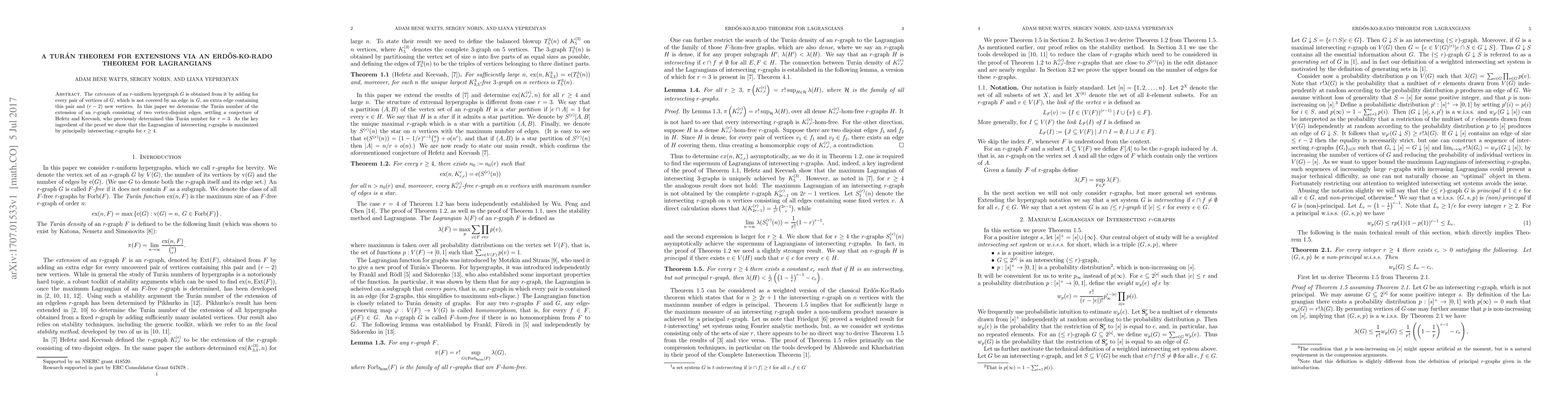 The extension of an $r$-uniform hypergraph $G$ is obtained from it by adding for every pair of vertices of $G$, which is not covered by an edge in $G$, an extra edge containing this pair and $(r-2)$ new vertices. In this paper we determine the Tur\'an number of the extension of an $r$-graph consisting of two vertex-disjoint edges, settling a conjecture of Hefetz and Keevash, who previously determined this Tur\'an number for $r=3$. As the key ingredient of the proof we show that the Lagrangian of intersecting $r$-graphs is maximized by principally intersecting $r$-graphs for $r \geq 4$.
