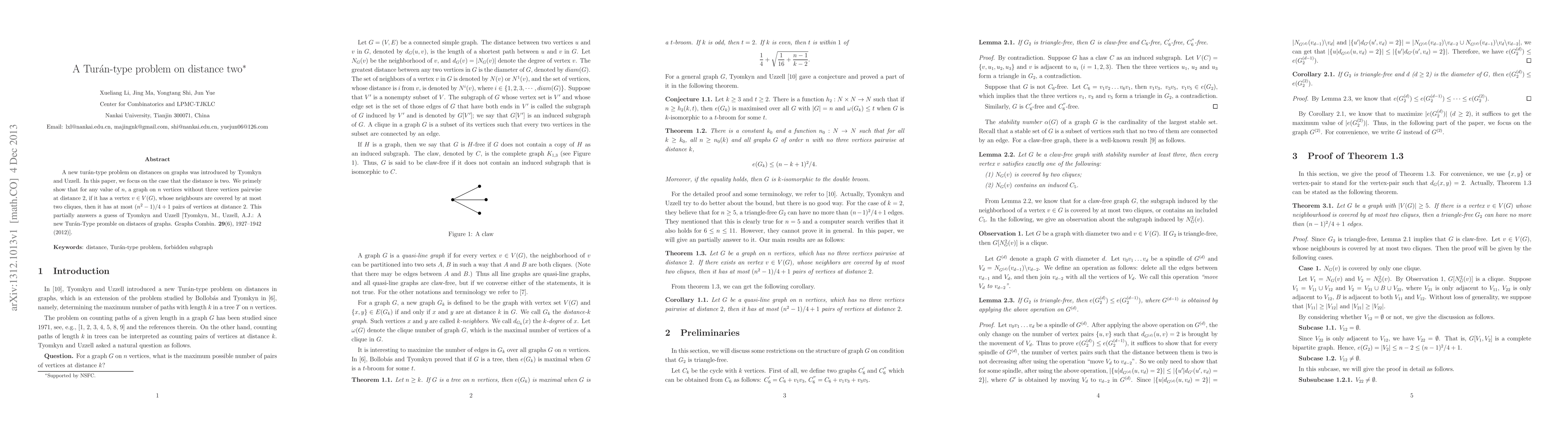 A new tur\'an-type problem on distances on graphs was introduced by Tyomkyn and Uzzell. In this paper, we focus on the case that the distance is two. We primely show that for any value of $n$, a graph on $n$ vertices without three vertices pairwise at distance $2$, if it has a vertex $v \in V(G)$, whose neighbours are covered by at most two cliques, then it has at most $(n^2 - 1)/4 + 1$ pairs of vertices at distance $2$. This partially answers a guess of Tyomkyn and Uzzell [Tyomkyn, M., Uzzell, A.J.: A new Tur\'an-Type promble on distaces of graphs. Graphs Combin. {\bf 29}(6), 1927--1942 (2012)].