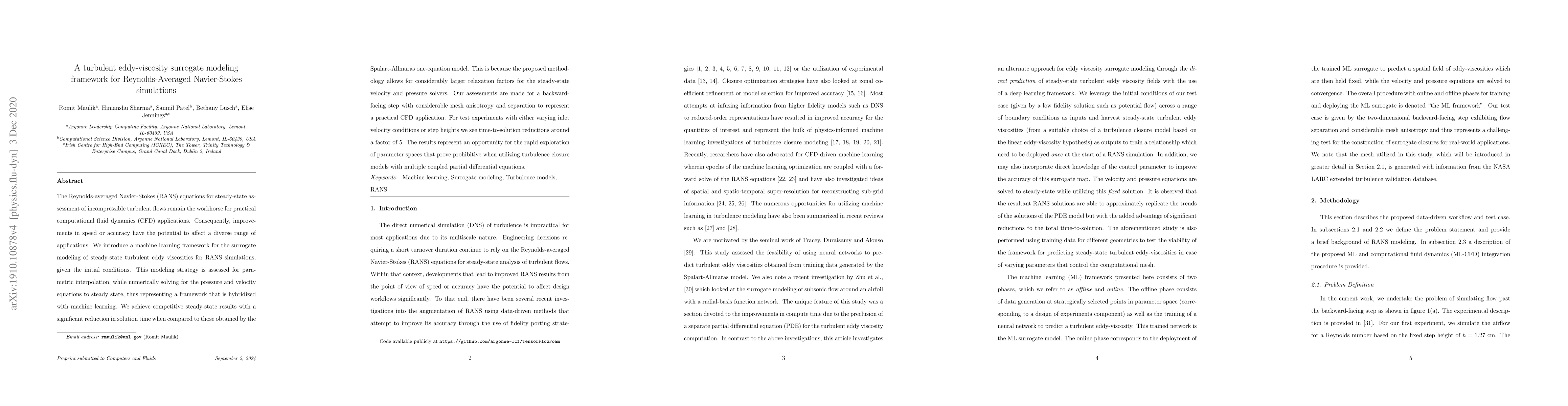 This paper presents a machine learning framework for surrogate modeling of turbulent eddy viscosities in RANS simulations, achieving competitive results with a significant reduction in solution time compared to traditional models. The proposed method allows for larger relaxation factors, leading to time-to-solution reductions of around a factor of 5 in practical CFD applications.