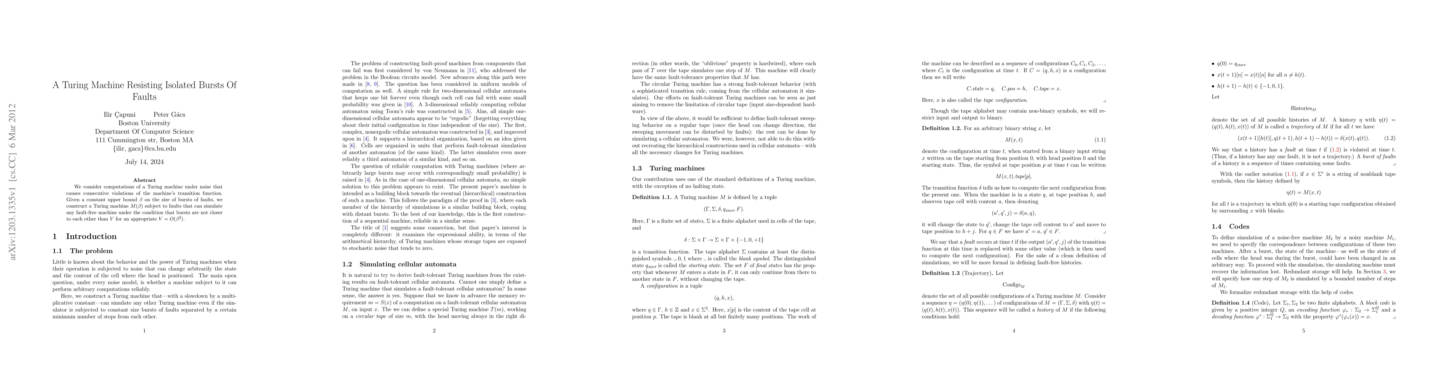 This paper constructs a fault-tolerant Turing machine M(B) that can simulate any fault-free machine under noise, provided that consecutive faults occur in isolated bursts of size B with a minimum separation distance of V = O(B^2). The machine is designed to resist isolated bursts of faults effectively.