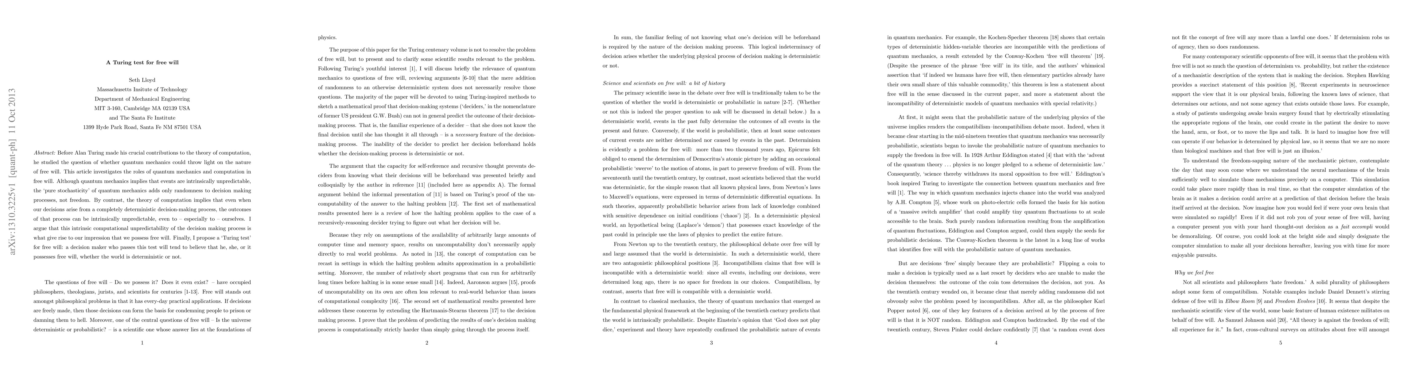 This paper explores the interplay between quantum mechanics, computation, and the concept of free will, arguing that intrinsic computational unpredictability, rather than quantum randomness, is what gives rise to our perception of free will. The author proposes a "Turing test" for free will to assess belief in free will regardless of determinism.