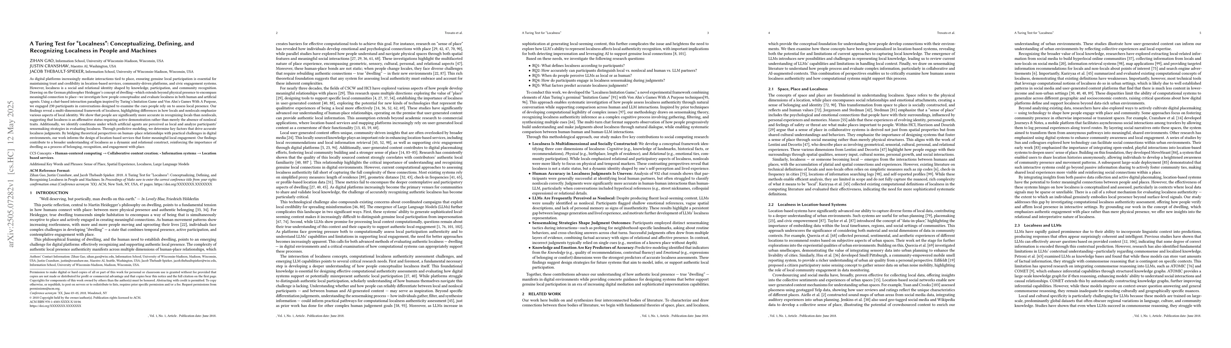 As digital platforms increasingly mediate interactions tied to place, ensuring genuine local participation is essential for maintaining trust and credibility in location-based services, community-driven platforms, and civic engagement systems. However, localness is a social and relational identity shaped by knowledge, participation, and community recognition. Drawing on the German philosopher Heidegger's concept of dwelling -- which extends beyond physical presence to encompass meaningful connection to place -- we investigate how people conceptualize and evaluate localness in both human and artificial agents. Using a chat-based interaction paradigm inspired by Turing's Imitation Game and Von Ahn's Games With A Purpose, we engaged 230 participants in conversations designed to examine the cues people rely on to assess local presence. Our findings reveal a multi-dimensional framework of localness, highlighting differences in how locals and nonlocals emphasize various aspects of local identity. We show that people are significantly more accurate in recognizing locals than nonlocals, suggesting that localness is an affirmative status requiring active demonstration rather than merely the absence of nonlocal traits. Additionally, we identify conditions under which artificial agents are perceived as local and analyze participants' sensemaking strategies in evaluating localness. Through predictive modeling, we determine key factors that drive accurate localness judgments. By bridging theoretical perspectives on human-place relationships with practical challenges in digital environments, our work informs the design of location-based services that foster meaningful local engagement. Our findings contribute to a broader understanding of localness as a dynamic and relational construct, reinforcing the importance of dwelling as a process of belonging, recognition, and engagement with place.