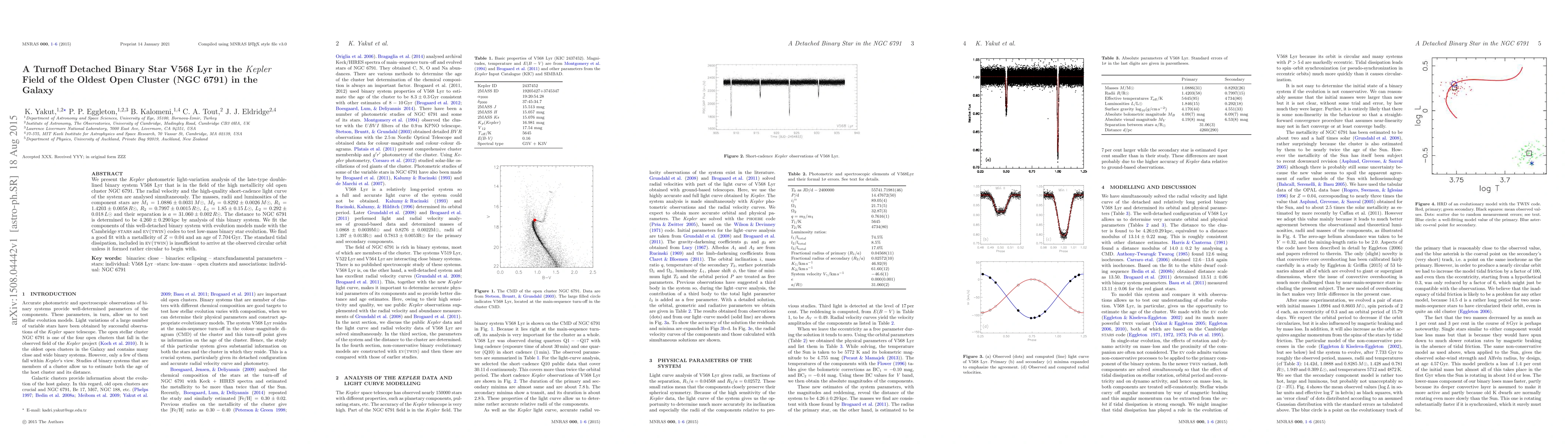 This paper analyzes the Kepler photometric light-variation of the binary star V568 Lyr in the old open cluster NGC 6791, determining its mass, radius, and luminosity for both components. The study finds a good fit with evolutionary models, suggesting an age of 7.704 Gyr and a metallicity of 0.04, but notes that standard tidal dissipation may not fully explain the observed circular orbit.