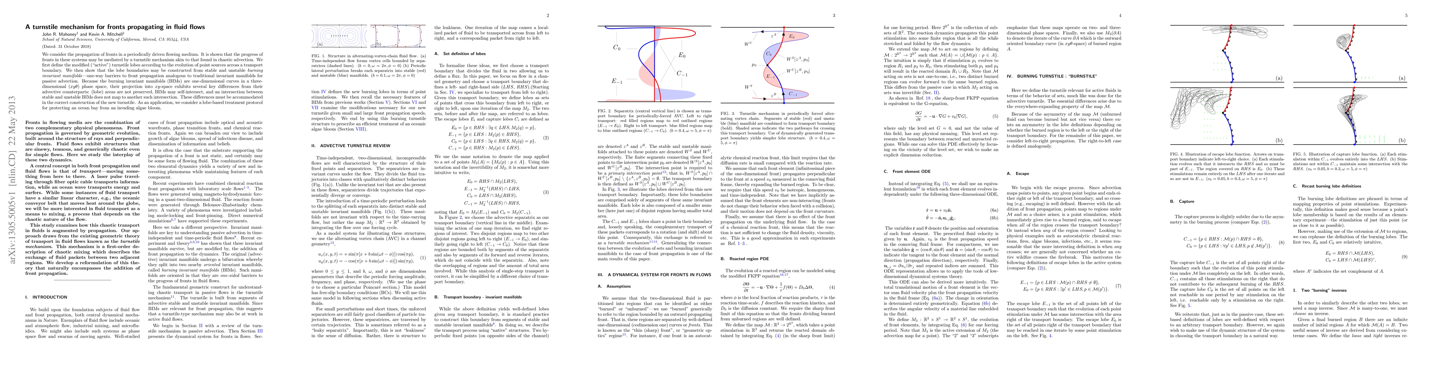 We consider the propagation of fronts in a periodically driven flowing medium. It is shown that the progress of fronts in these systems may be mediated by a turnstile mechanism akin to that found in chaotic advection. We first define the modified ("active") turnstile lobes according to the evolution of point sources across a transport boundary. We then show that the lobe boundaries may be constructed from stable and unstable \emph{burning invariant manifolds}---one-way barriers to front propagation analogous to traditional invariant manifolds for passive advection. Because the burning invariant manifolds (BIMs) are one-dimensional curves in a three-dimensional ($xy\theta$) phase space, their projection into $xy$-space exhibits several key differences from their advective counterparts: (lobe) areas are not preserved, BIMs may self-intersect, and an intersection between stable and unstable BIMs does not map to another such intersection. These differences must be accommodated in the correct construction of the new turnstile. As an application, we consider a lobe-based treatment protocol for protecting an ocean bay from an invading algae bloom.