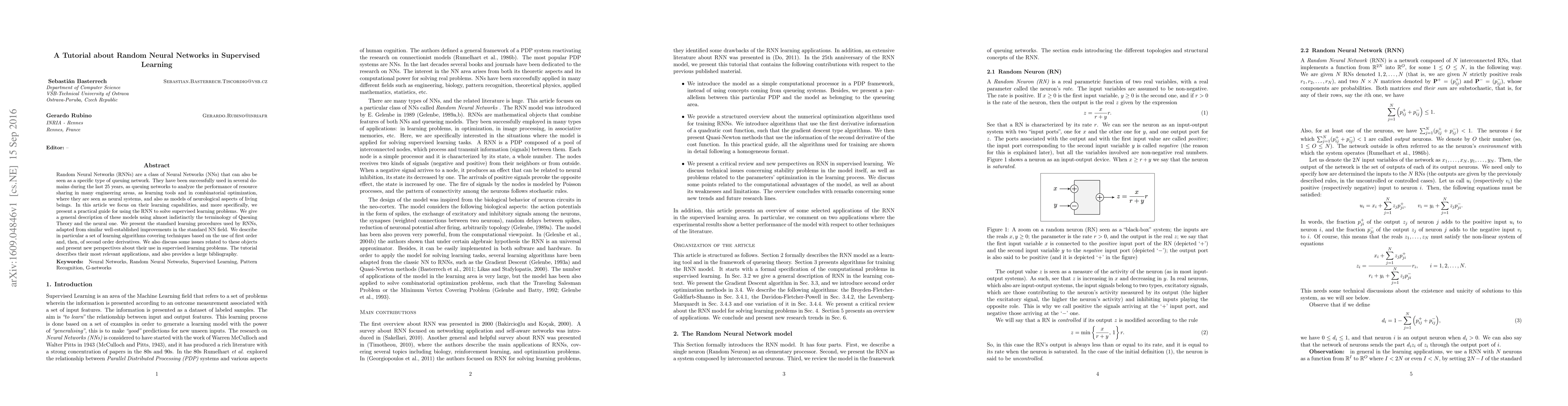 This paper provides a comprehensive tutorial on Random Neural Networks (RNNs) for supervised learning, detailing their learning procedures and applications, and bridging concepts from queuing theory and neural networks. It covers standard learning algorithms and discusses potential issues and future perspectives.