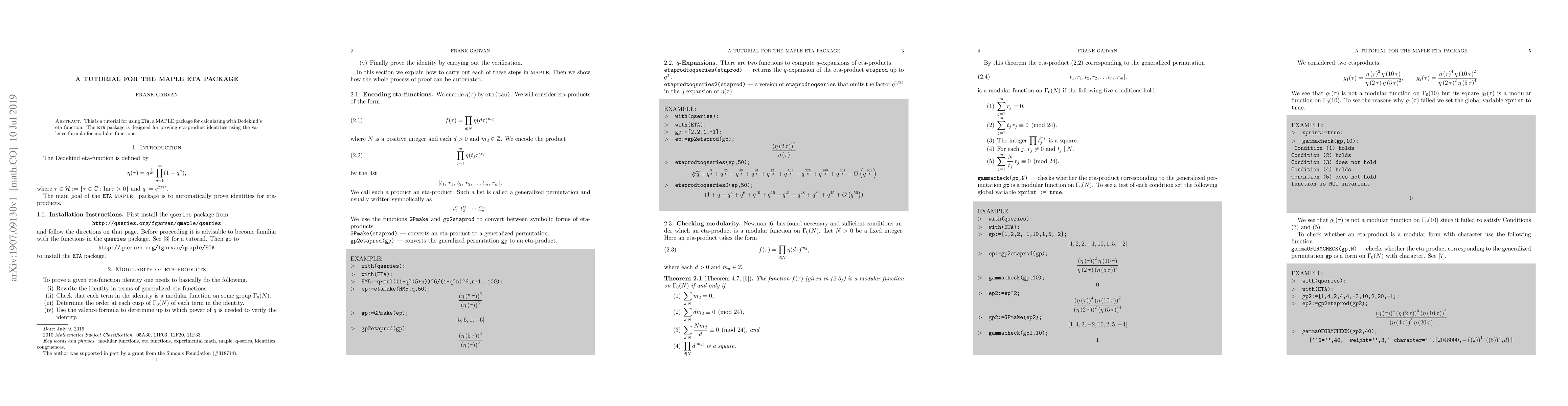This tutorial introduces the MAPLE ETA package, which facilitates calculations with Dedekind's eta function and proves eta-product identities via the valence formula for modular functions.