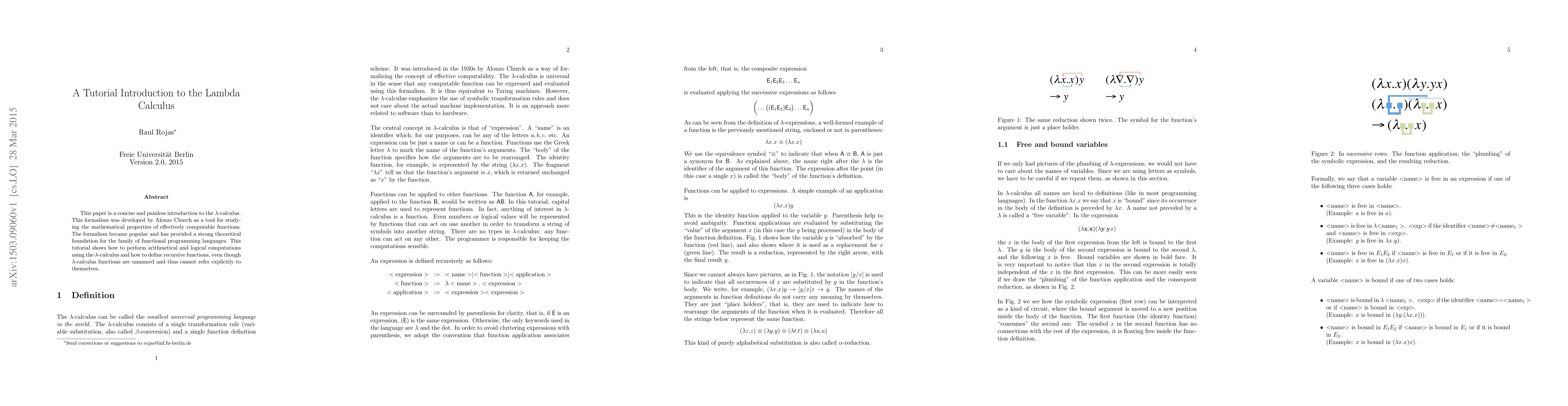 This paper is a concise and painless introduction to the $\lambda$-calculus. This formalism was developed by Alonzo Church as a tool for studying the mathematical properties of effectively computable functions. The formalism became popular and has provided a strong theoretical foundation for the family of functional programming languages. This tutorial shows how to perform arithmetical and logical computations using the $\lambda$-calculus and how to define recursive functions, even though $\lambda$-calculus functions are unnamed and thus cannot refer explicitly to themselves.