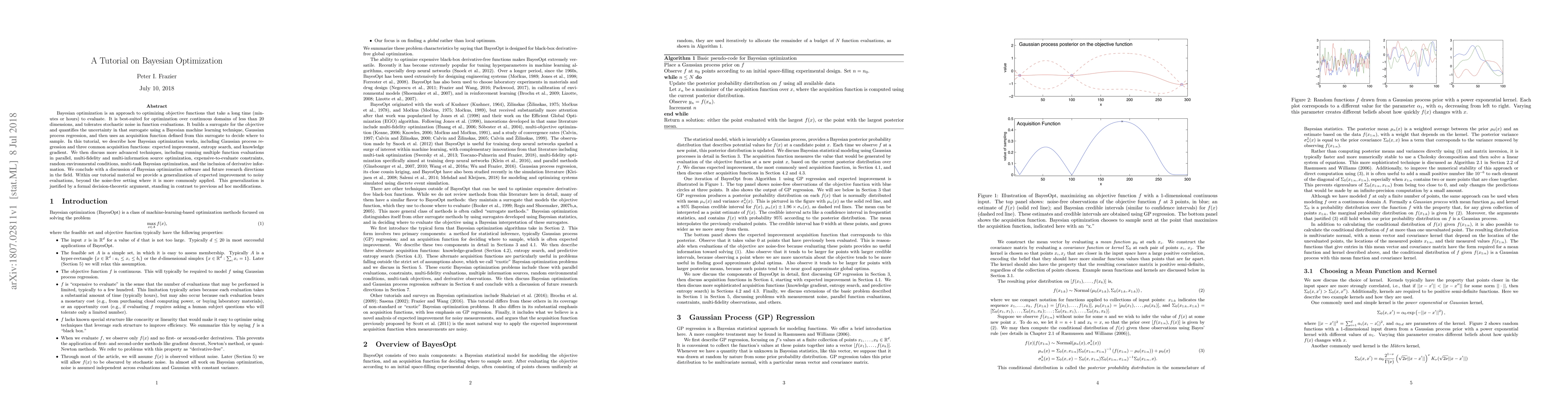 This tutorial provides a comprehensive overview of Bayesian optimization, detailing its use for optimizing slow-to-evaluate objective functions, and introduces Gaussian process regression and acquisition functions like expected improvement, entropy search, and knowledge gradient. It also covers advanced topics and generalizations, and discusses software and future research directions.
