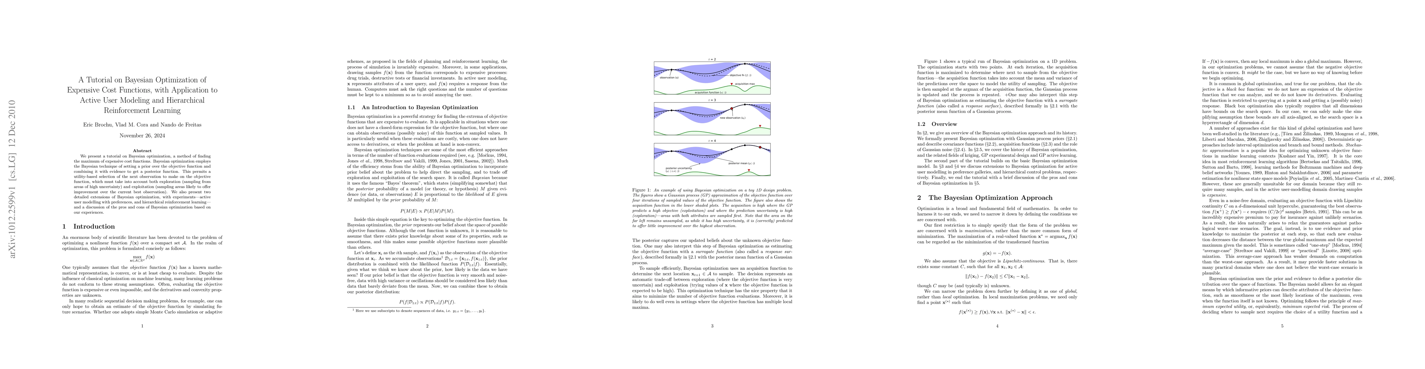 This tutorial explores Bayesian optimization for maximizing expensive cost functions, emphasizing the balance between exploration and exploitation. It extends the method to active user modeling and hierarchical reinforcement learning, providing insights into its practical applications and limitations.