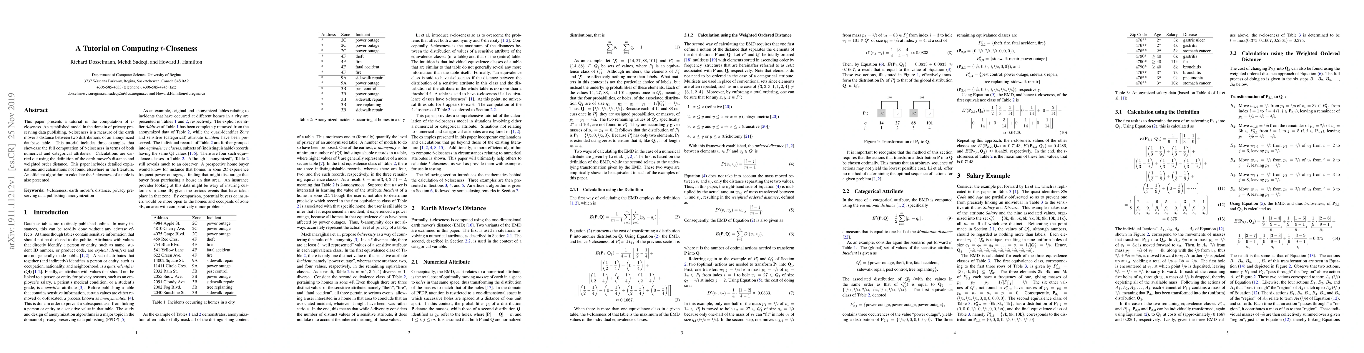 This paper presents a tutorial of the computation of $t$-closeness. An established model in the domain of privacy preserving data publishing, $t$-closeness is a measure of the earth mover's distance between two distributions of an anonymized database table. This tutorial includes three examples that showcase the full computation of $t$-closeness in terms of both numerical and categorical attributes. Calculations are carried out using the definition of the earth mover's distance and weighted order distance. This paper includes detailed explanations and calculations not found elsewhere in the literature. An efficient algorithm to calculate the $t$-closeness of a table is also presented.
