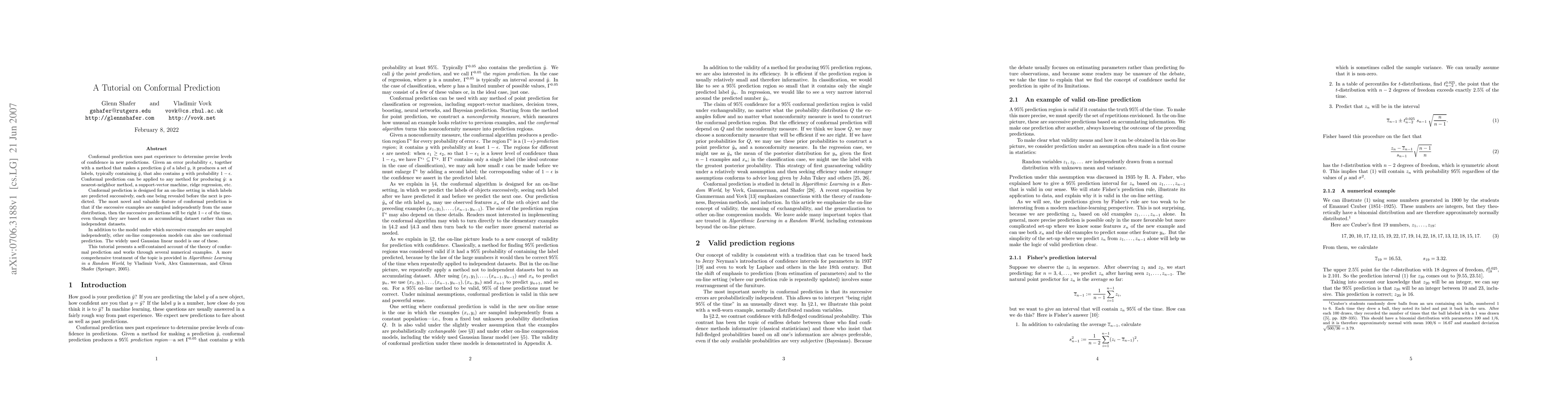 This tutorial provides a comprehensive overview of conformal prediction, a method that determines confidence levels for new predictions based on past experience. It highlights how conformal prediction can be applied to various prediction methods and works in an online setting where predictions are made successively, maintaining accuracy even with accumulating data.