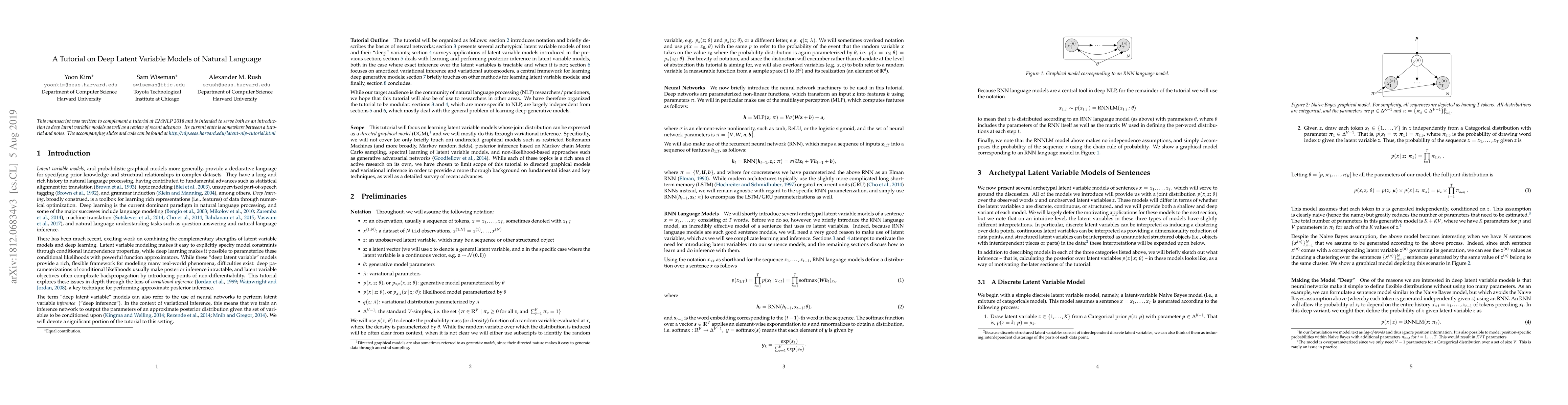 There has been much recent, exciting work on combining the complementary strengths of latent variable models and deep learning. Latent variable modeling makes it easy to explicitly specify model constraints through conditional independence properties, while deep learning makes it possible to parameterize these conditional likelihoods with powerful function approximators. While these "deep latent variable" models provide a rich, flexible framework for modeling many real-world phenomena, difficulties exist: deep parameterizations of conditional likelihoods usually make posterior inference intractable, and latent variable objectives often complicate backpropagation by introducing points of non-differentiability. This tutorial explores these issues in depth through the lens of variational inference.