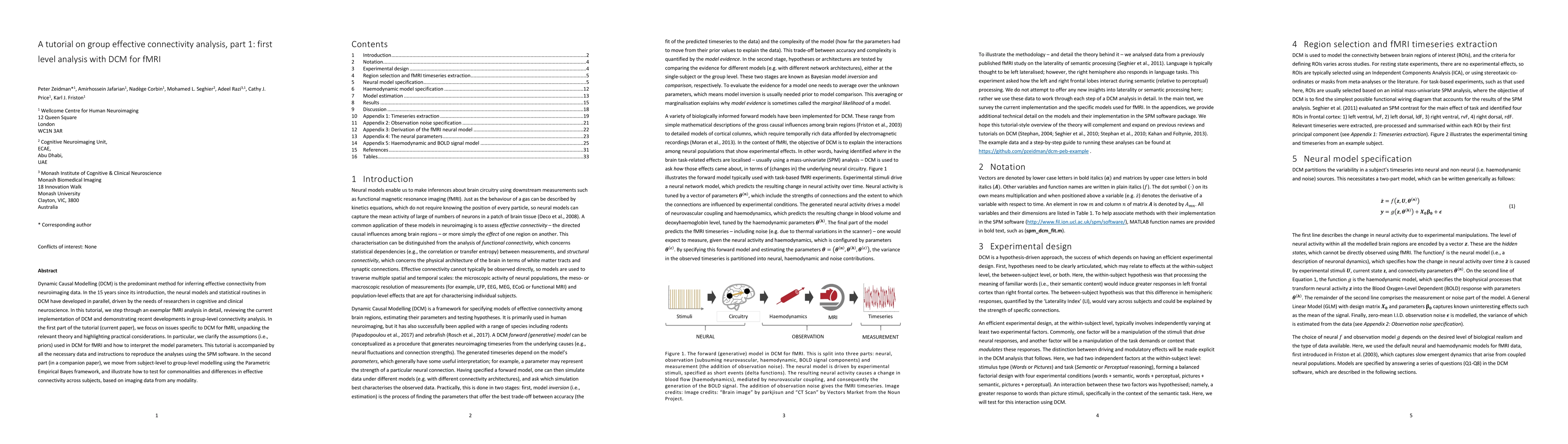 This tutorial explains how to analyze brain connectivity using Dynamic Causal Modelling (DCM) on functional magnetic resonance imaging (fMRI) data, focusing on group-level analysis and effective connectivity parameters.