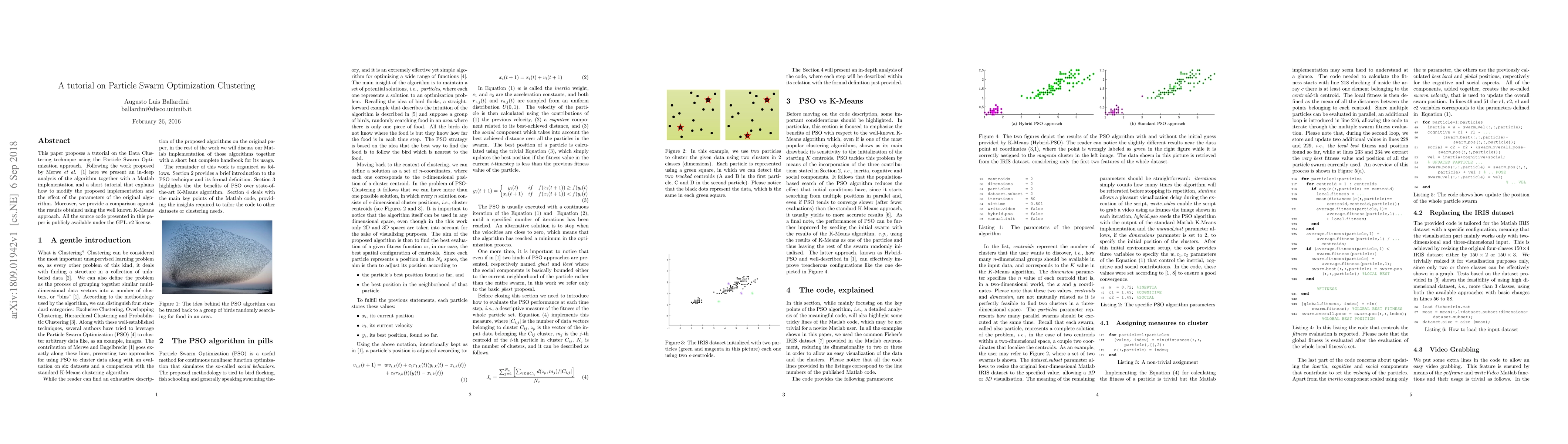 This paper provides a comprehensive tutorial on clustering using Particle Swarm Optimization (PSO), including a detailed analysis, Matlab implementation, and parameter modification guidance. It also compares PSO results against the K-Means approach, with all source code available under GPL-v2.