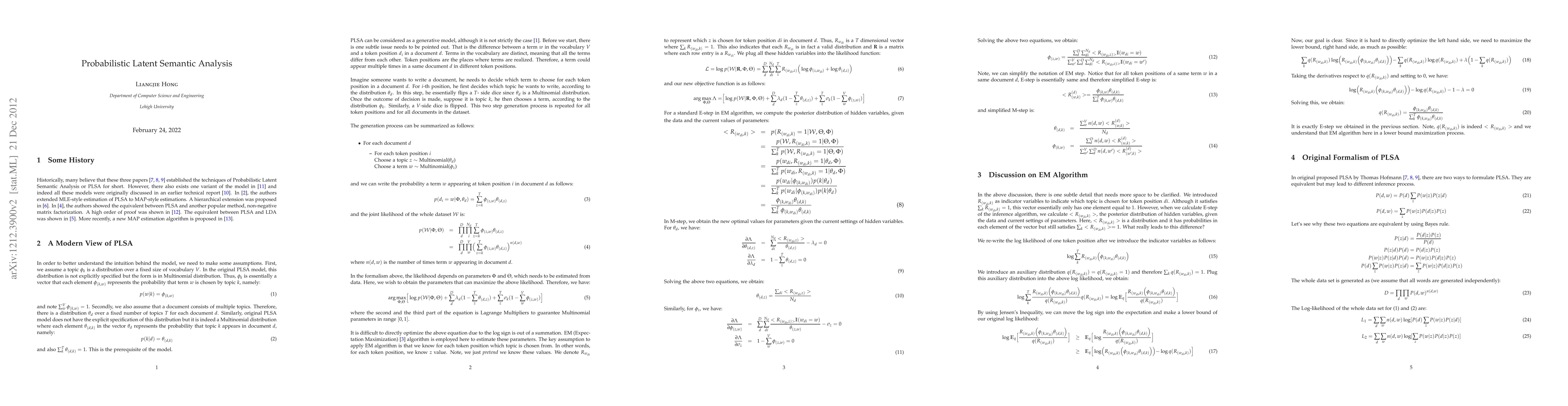 In this tutorial, I will discuss the details about how Probabilistic Latent Semantic Analysis (PLSA) is formalized and how different learning algorithms are proposed to learn the model.