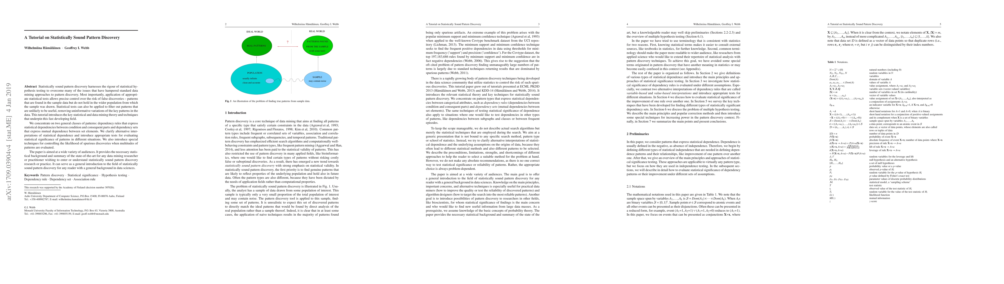 This paper provides a comprehensive tutorial on statistically sound pattern discovery using rigorous statistical hypothesis testing to control false discoveries and filter out uninformative patterns. It focuses on dependency rules and sets, introducing statistical tests for evaluating significance and techniques to manage spurious discoveries.