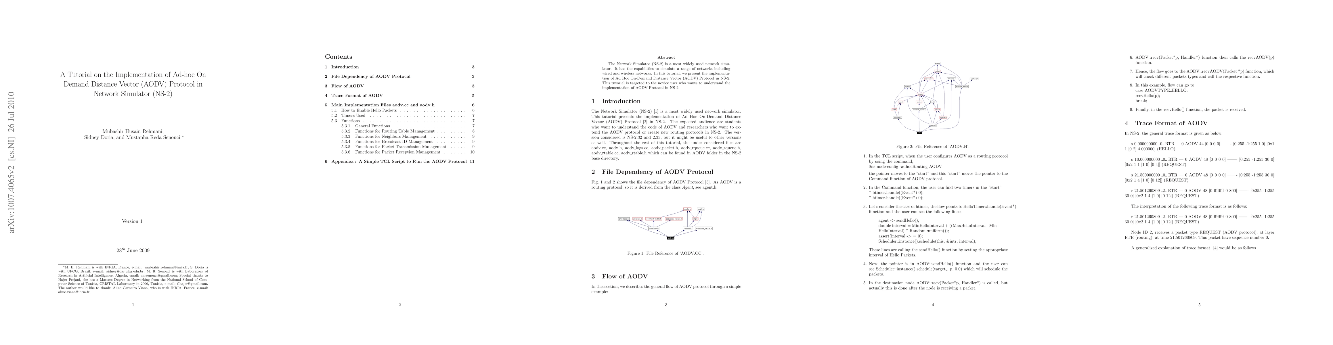 This tutorial guides novice users through implementing the Ad-hoc On-Demand Distance Vector (AODV) Protocol in NS-2, a widely used network simulator for simulating both wired and wireless networks. It aims to help users understand the AODV protocol's practical application within NS-2.