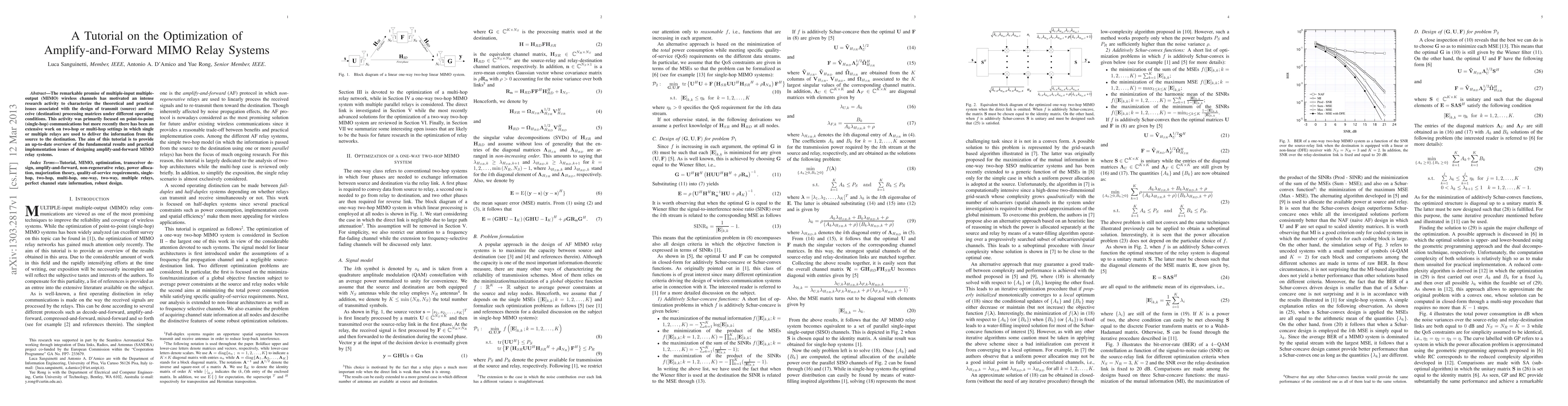 This tutorial offers a comprehensive overview of the theoretical and practical aspects of optimizing amplify-and-forward MIMO relay systems, focusing on the design of transmit and receive processing matrices for multi-hop communication scenarios. It addresses both fundamental results and implementation challenges.
