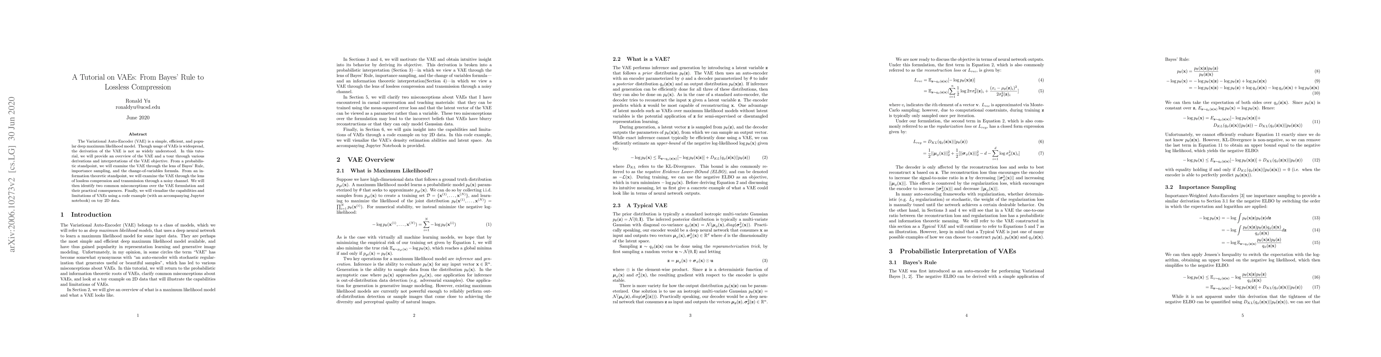 This paper provides a comprehensive tutorial on Variational Auto-Encoders (VAEs), explaining their derivation from Bayes' Rule and importance sampling, and their application in lossless compression. It also addresses common misconceptions and demonstrates VAE capabilities with a 2D data example.