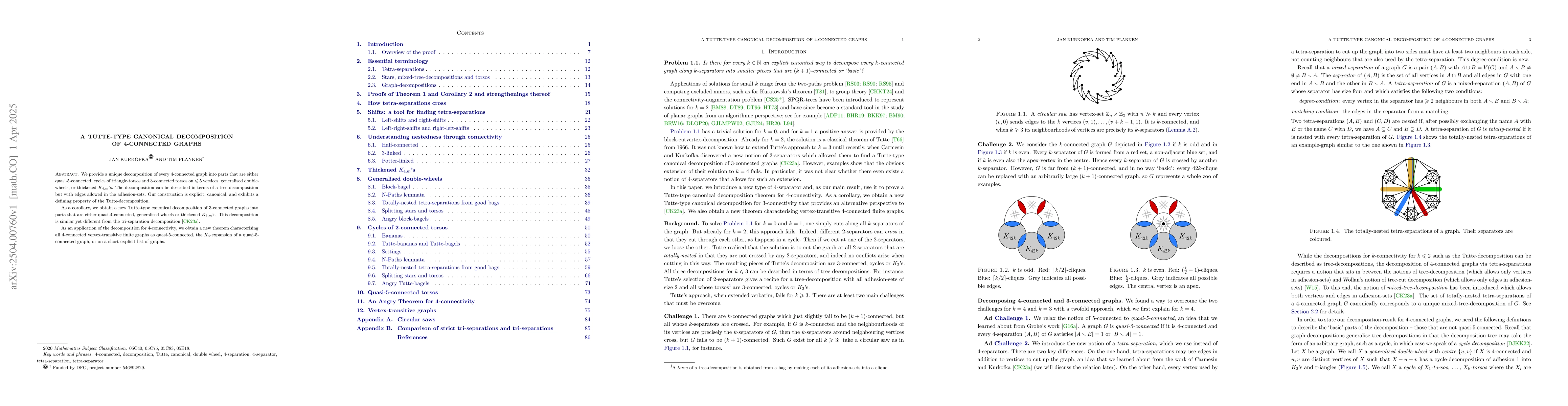 The paper presents an explicit, canonical decomposition of 4-connected graphs into specified parts using a tree-decomposition with edges in adhesion-sets, generalizing Tutte's decomposition.