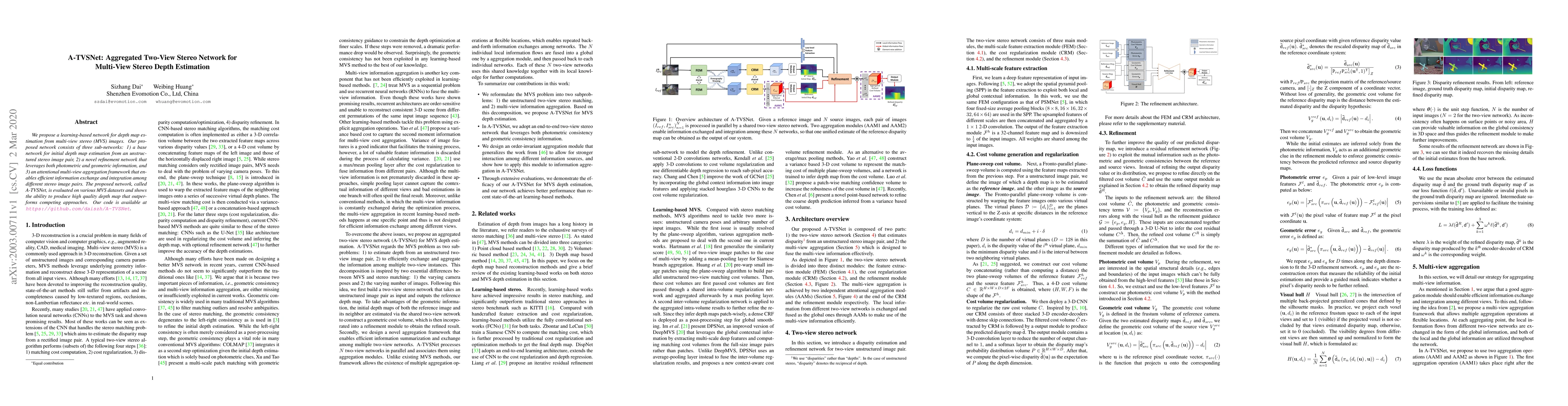We propose a learning-based network for depth map estimation from multi-view stereo (MVS) images. Our proposed network consists of three sub-networks: 1) a base network for initial depth map estimation from an unstructured stereo image pair, 2) a novel refinement network that leverages both photometric and geometric information, and 3) an attentional multi-view aggregation framework that enables efficient information exchange and integration among different stereo image pairs. The proposed network, called A-TVSNet, is evaluated on various MVS datasets and shows the ability to produce high quality depth map that outperforms competing approaches. Our code is available at https://github.com/daiszh/A-TVSNet.