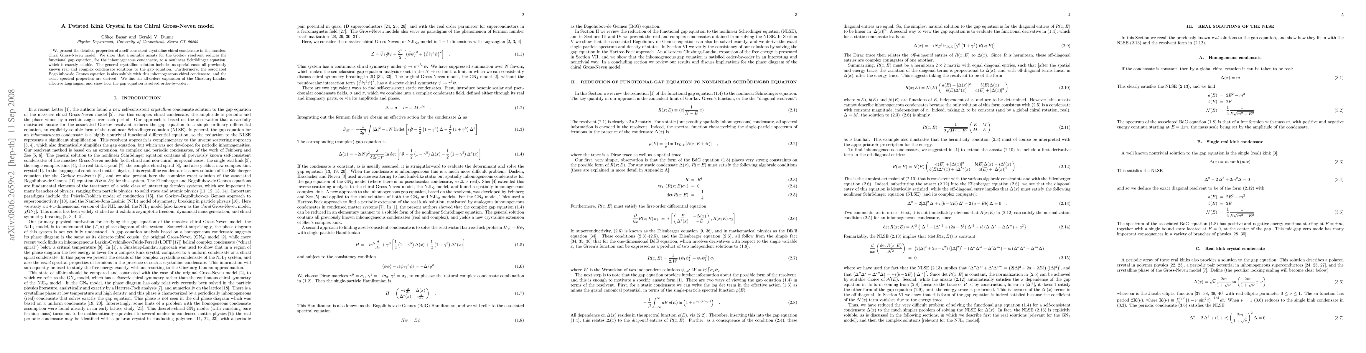This paper explores the crystalline chiral condensate in the massless Gross-Neveu model, demonstrating that a nonlinear Schrödinger equation can be derived from the functional gap equation. The study reveals an all-orders expansion of the Ginzburg-Landau effective Lagrangian and provides exact solutions for the associated Bogoliubov-de Gennes equation.
