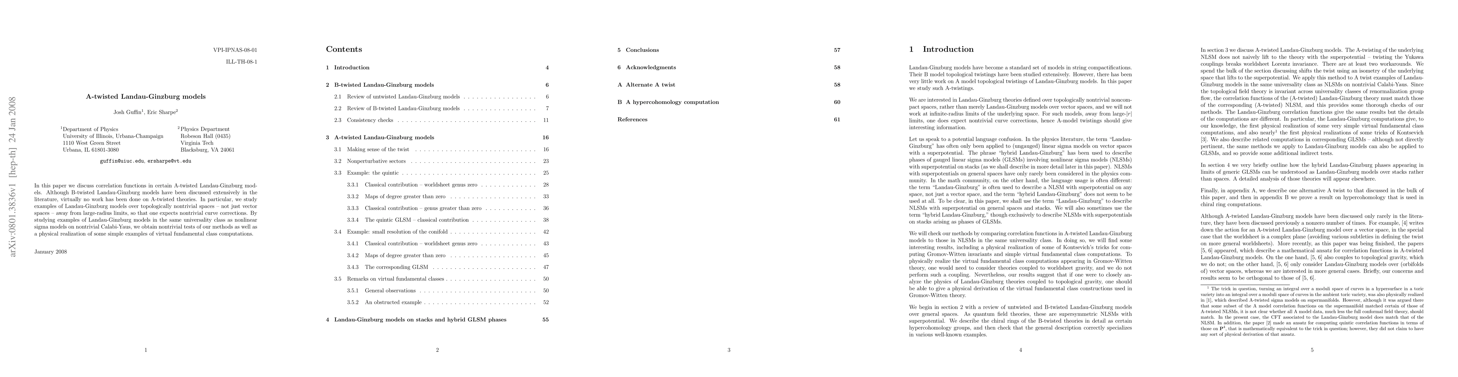 This paper explores correlation functions in A-twisted Landau-Ginzburg models, focusing on examples over topologically nontrivial spaces like Calabi-Yaus, providing nontrivial curve corrections and physical realizations for fundamental class computations. It aims to advance understanding of these relatively unexplored A-twisted theories.